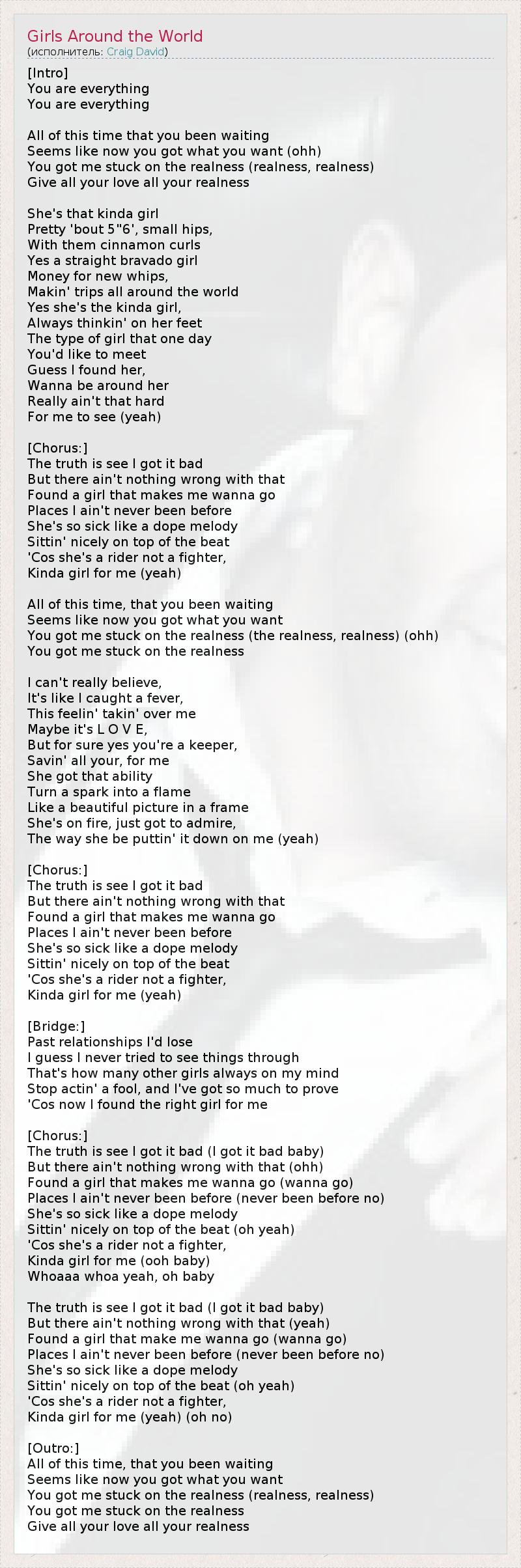 [Intro] You are everything You are everything All of this time that you been waiting Seems like now you got what you want (ohh) You got me stuck on the realness (realness, realness) Give all your love all your realness She's that kinda girl Pretty 'bout 5"6', small hips, With them cinnamon curls Yes a straight bravado girl Money for new whips, Makin' trips all around the world Yes she's the kinda girl, Always thinkin' on her feet The type of girl that one day You'd like to meet Guess I found her, Wanna be around her Really ain't that hard For me to see (yeah) [Chorus:] The truth is see I got it bad But there ain't nothing wrong with that Found a girl that makes me wanna go Places I ain't never been before She's so sick like a dope melody Sittin' nicely on top of the beat 'Cos she's a rider not a fighter, Kinda girl for me (yeah) All of this time, that you been waiting Seems like now you got what you want You got me stuck on the realness (the realness, realness) (ohh) You got me stuck on the realness I can't really believe, It's like I caught a fever, This feelin' takin' over me Maybe it's L O V E, But for sure yes you're a keeper, Savin' all your, for me She got that ability Turn a spark into a flame Like a beautiful picture in a frame She's on fire, just got to admire, The way she be puttin' it down on me (yeah) [Chorus:] The truth is see I got it bad But there ain't nothing wrong with that Found a girl that makes me wanna go Places I ain't never been before She's so sick like a dope melody Sittin' nicely on top of the beat 'Cos she's a rider not a fighter, Kinda girl for me (yeah) [Bridge:] Past relationships I'd lose I guess I never tried to see things through That's how many other girls always on my mind Stop actin' a fool, and I've got so much to prove 'Cos now I found the right girl for me [Chorus:] The truth is see I got it bad (I got it bad baby) But there ain't nothing wrong with that (ohh) Found a girl that makes me wanna go (wanna go) Places I ain't never been before (never been before no) She's so sick like a dope melody Sittin' nicely on top of the beat (oh yeah) 'Cos she's a rider not a fighter, Kinda girl for me (ooh baby) Whoaaa whoa yeah, oh baby The truth is see I got it bad (I got it bad baby) But there ain't nothing wrong with that (yeah) Found a girl that make me wanna go (wanna go) Places I ain't never been before (never been before no) She's so sick like a dope melody Sittin' nicely on top of the beat (oh yeah) 'Cos she's a rider not a fighter, Kinda girl for me (yeah) (oh no) [Outro:] All of this time, that you been waiting Seems like now you got what you want You got me stuck on the realness (realness, realness) You got me stuck on the realness Give all your love all your realness