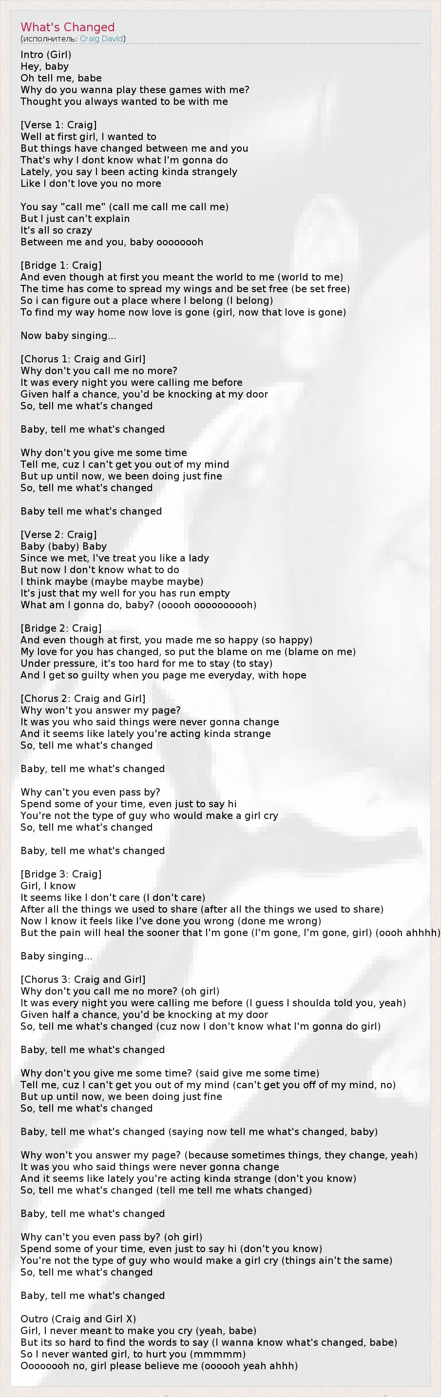 [Интро: Девушка] Эй, малыш! Скажи мне Почему ты захотел поиграть именно со мной? Я ведь думала, ты всегда хочешь быть со мной. [1-ый куплет: Craig] Да, сначала, девочка, я хотел этого. Но все изменилось между нами. И поэтому я не знаю, что мне теперь делать. Недавно ты сказала, что я веду себя странно, Как будто я тебя больше не люблю. Ты сказала:"Позвони мне" (позвони, позвони мне), Я не знал, что сказать. Все так сложно! То, что происхоит между нами, дорогая. [Переход 1: Craig] И хоть сначала ты была для меня всем (целым миром), Но пришло время расправить крылья и стать свободным (стать свободным). Чтобы я нашел свое место в жизни (истинное место). Нашел дорогу домой; вообщем,любовь прошла (дорогая, любовь прошла). Теперь ты... [Привев 1: Craig и Девушка] Почему же ты мне больше не звонишь? Раньше ты мне звонил каждую ночь, А если был шанс, ты сразу приходил, Так скажи мне, что же произошло? Малыш, скажи мне, что случилось? Почему же ты не уделяешь мне время? Скажи мне, я ведь постоянно о тебе думаю. До этого все было так хорошо, Так скажи мне, что произошло? Малыш, скажи мне, что-то изменилось? [2-ой куплет: Craig] Малышка (малышка), С того момента, как мы познакомились, я обращался с тобой, как с леди. Но сейчас я не знаю, что мне делать. Я думаю, может быть (возможно, возможно)... Все это просто превратилось в пустоту. Но что же мне делать, малышка? [Переход 2: Craig] Даже если подумать, что сначала ты делала меня таким счастливым, Моя любовь к тебе изменилась, вини меня. Это давит на меня, мне так трудно остаться. Я чувствую себя таким виноватым, когда ты пишешь мне каждый день с надеждой. [Привев 2: Craig и Девушка] Почему ты не отвечаешь на мои письма? Ведь ты сам говорил, что ничего никогда не изменится. И мне кажется, что ты стал каким-то чужим, Скажи мне, что случилось? Малыш, скажи, в чем дело? Почему ты меня не замечаешь? Находишь время только для того, чтобы сказать "Привет!" Ты ведь не из тех парней, кто заставляет девушек плакать, Так скажи мне, что-то изменилось? Малыш, что изменилось? [Переход 3: Craig] Да, девочка, я знаю, Тебе кажется, что мне все равно(мне наплевать). После всего, что было с нами (всего, что было с нами). Теперь я знаю, все так, будто я поступил с тобой неправильно (неправильно), Но боль скоро пройдет, поэтому я ухожу (ухожу...). Теперь ты... [Привев 3: Craig и Девушка] Почему ты мне больше не звонишь (о, дорогая)? Раньше ты мне звонил каждую ночь(должно быть, я должен был сказать), А если был шанс, ты сразу приходил, Так скажи мне, что же произошло (я не знаю, что мне делать теперь)? Малыш, скажи мне, что произошло? Почему ты мне не уделяешь время (говорила, удели мне время)? Скажи мне, я постоянно о тебе думаю (не могу выкинуть тебя из головы). Ведь до этого все было так хорошо, Так скажи мне, что произошло? Малыш, скажи мне, что произошло? Почему ты не отвечаешь на мои письма (потому, что иногда все меняется)? Ведь ты сам говорил, что ничего никогда не изменится. И мне кажется, что ты стал каким-то чужим (разве ты не знаешь), Скажи мне, что случилось? Малыш, скажи, в чем дело? Почему ты меня не замечаешь (о, дорогая)? Находишь время только для того, чтобы сказать "Привет!" (разве ты не знаешь) Ты ведь не из тех, кто заставляет девушек плакать (все не как прежде), Так скажи мне, что-то изменилось? Малыш, что изменилось? [Послелог: Craig и Девушка] Девочка, я не хотел, чтобы ты плакала (нет, не хотел), Но мне очень трудно сейчас найти нужн