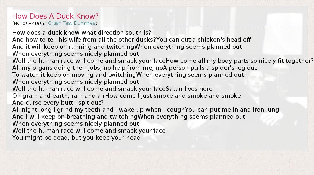 А как ты думаешь, о чем песня "How Does A Duck Know?" ?