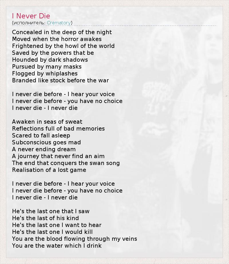 Это интересно:Crematory — немецкая метал-группа, сейчас играющая в стиле gothic metal / industrial metal. Сформирована в Вестхофене, Германия, в 1991 году. Группа стала узнаваемой в середине 1990-х, выступая в турне на разогреве таких команд, как My Dying Bride, Tiamat и Atrocity. Группа начала с традиционного death... продолжение