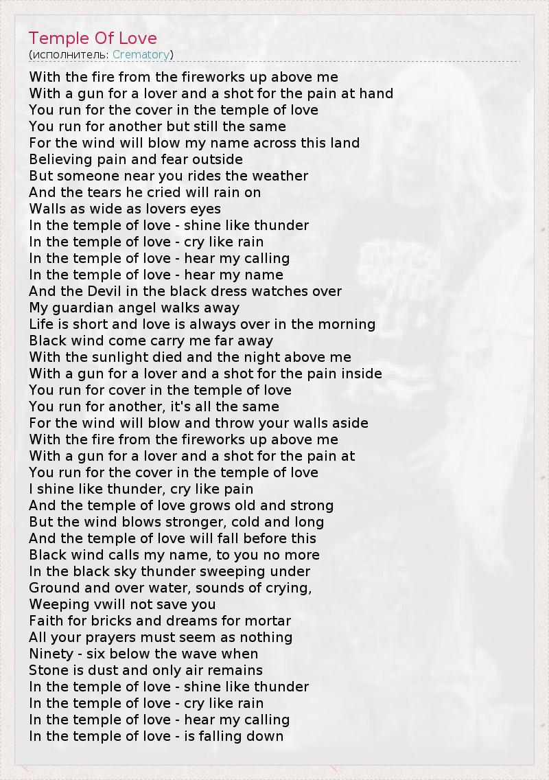 With the fire from the fireworks up above me With a gun for a lover and a shot for the pain at hand You run for the cover in the temple of love You run for another but still the same For the wind will blow my name across this land Believing pain and fear outside But someone near you rides the weather And the tears he cried will rain on Walls as wide as lovers eyes In the temple of love - shine like thunder In the temple of love - cry like rain In the temple of love - hear my calling In the temple of love - hear my name And the Devil in the black dress watches over My guardian angel walks away Life is short and love is always over in the morning Black wind come carry me far away With the sunlight died and the night above me With a gun for a lover and a shot for the pain inside You run for cover in the temple of love You run for another, it's all the same For the wind will blow and throw your walls aside With the fire from the fireworks up above me With a gun for a lover and a shot for the pain at You run for the cover in the temple of love I shine like thunder, cry like pain And the temple of love grows old and strong But the wind blows stronger, cold and long And the temple of love will fall before this Black wind calls my name, to you no more In the black sky thunder sweeping under Ground and over water, sounds of crying, Weeping vwill not save you Faith for bricks and dreams for mortar All your prayers must seem as nothing Ninety - six below the wave when Stone is dust and only air remains In the temple of love - shine like thunder In the temple of love - cry like rain In the temple of love - hear my calling In the temple of love - is falling down