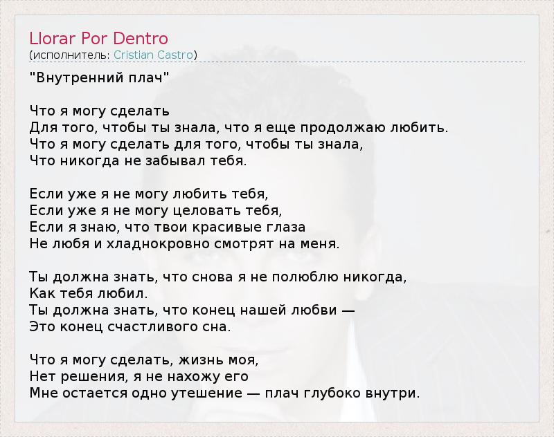 "Внутренний плач" Что я могу сделать Для того, чтобы ты знала, что я еще продолжаю любить. Что я могу сделать для того, чтобы ты знала, Что никогда не забывал тебя. Если уже я не могу любить тебя, Если уже я не могу целовать тебя, Если я знаю, что твои красивые глаза Не любя и хладнокровно смотрят на меня. Ты должна знать, что снова я не полюблю никогда, Как тебя любил. Ты должна знать, что конец нашей любви — Это конец счастливого сна. Что я могу сделать, жизнь моя, Нет решения, я не нахожу его Мне остается одно утешение — плач глубоко внутри.