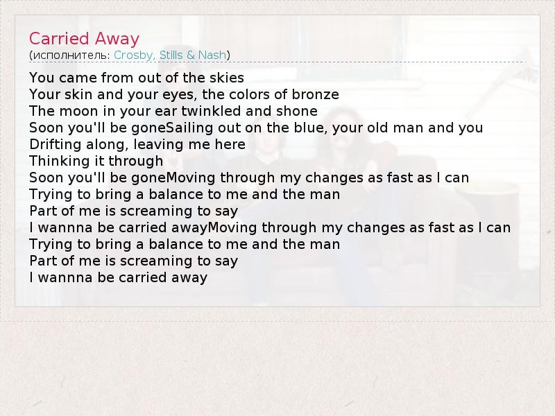You came from out of the skies Your skin and your eyes, the colors of bronze The moon in your ear twinkled and shone Soon you'll be goneSailing out on the blue, your old man and you Drifting along, leaving me here Thinking it through Soon you'll be goneMoving through my changes as fast as I can Trying to bring a balance to me and the man Part of me is screaming to say I wannna be carried awayMoving through my changes as fast as I can Trying to bring a balance to me and the man Part of me is screaming to say I wannna be carried away