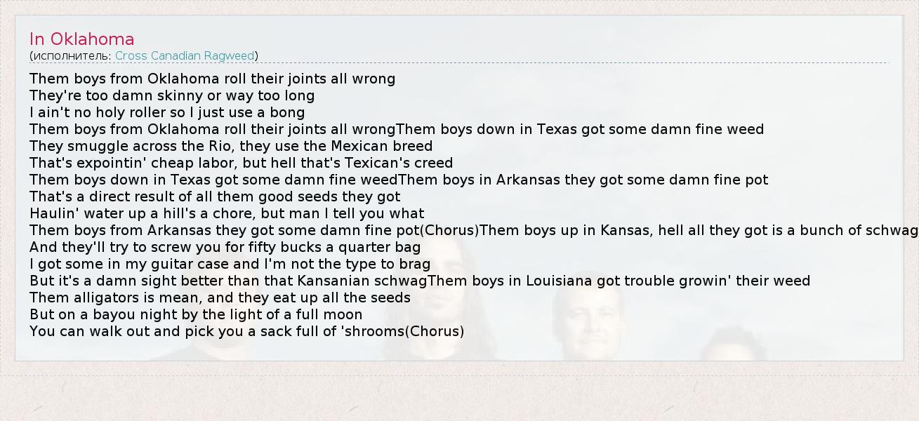 Them boys from Oklahoma roll their joints all wrongThem boys down in Texas got some damn fine weed