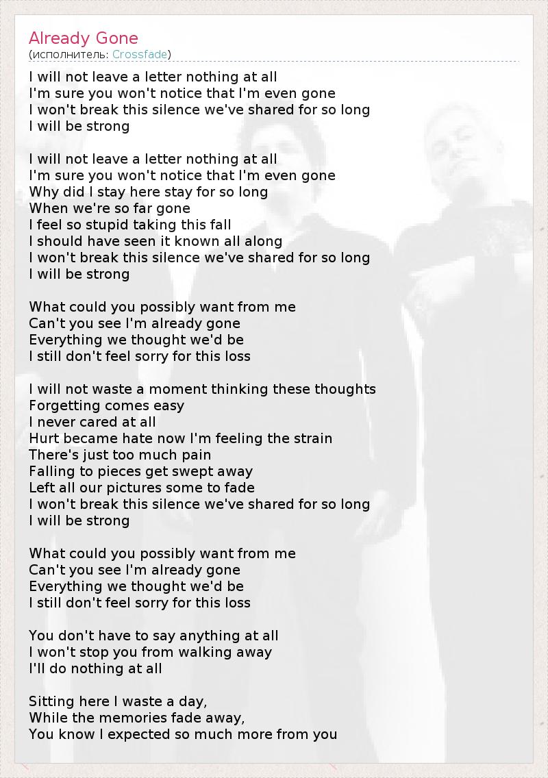 I will not leave a letter nothing at all I'm sure you won't notice that I'm even gone I won't break this silence we've shared for so long I will be strong I will not leave a letter nothing at all I'm sure you won't notice that I'm even gone Why did I stay here stay for so long When we're so far gone I feel so stupid taking this fall I should have seen it known all along I won't break this silence we've shared for so long I will be strong What could you possibly want from me Can't you see I'm already gone Everything we thought we'd be I still don't feel sorry for this loss I will not waste a moment thinking these thoughts Forgetting comes easy I never cared at all Hurt became hate now I'm feeling the strain There's just too much pain Falling to pieces get swept away Left all our pictures some to fade I won't break this silence we've shared for so long I will be strong What could you possibly want from me Can't you see I'm already gone Everything we thought we'd be I still don't feel sorry for this loss You don't have to say anything at all I won't stop you from walking away I'll do nothing at all Sitting here I waste a day, While the memories fade away, You know I expected so much more from you