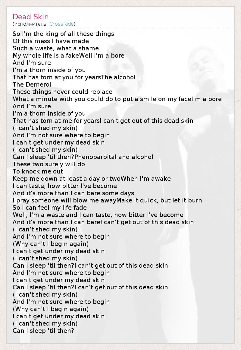 So I'm the king of all these things Of this mess I have made Such a waste, what a shame My whole life is a fakeWell I'm a bore And I'm sure I'm a thorn inside of you That has torn at you for yearsThe alcohol The Demerol These things never could replace What a minute with you could do to put a smile on my faceI'm a bore And I'm sure I'm a thorn inside of you That has torn at me for yearsI can't get out of this dead skin (I can't shed my skin) And I'm not sure where to begin I can't get under my dead skin (I can't shed my skin) Can I sleep 'til then?Phenobarbital and alcohol These two surely will do To knock me out Keep me down at least a day or twoWhen I'm awake I can taste, how bitter I've become And it's more than I can bare some days I pray someone will blow me awayMake it quick, but let it burn So I can feel my life fade Well, I'm a waste and I can taste, how bitter I've become And it's more than I can bareI can't get out of this dead skin (I can't shed my skin) And I'm not sure where to begin (Why can't I begin again) I can't get under my dead skin (I can't shed my skin) Can I sleep 'til then?I can't get out of this dead skin And I'm not sure where to begin I can't get under my dead skin Can I sleep 'til then?I can't get out of this dead skin (I can't shed my skin) And I'm not sure where to begin (Why can't I begin again) I can't get under my dead skin (I can't shed my skin) Can I sleep 'til then?