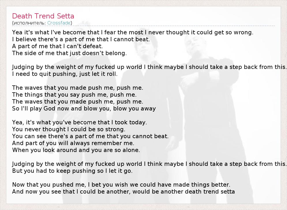 Yea it's what I've become that I fear the most I never thought it could get so wrong. I believe there's a part of me that I cannot beat. A part of me that I can't defeat. The side of me that just doesn't belong. Judging by the weight of my fucked up world I think maybe I should take a step back from this. I need to quit pushing, just let it roll. The waves that you made push me, push me. The things that you say push me, push me. The waves that you made push me, push me. So I'll play God now and blow you, blow you away Yea, it's what you've become that I took today. You never thought I could be so strong. You can see there's a part of me that you cannot beat. And part of you will always remember me. When you look around and you are so alone. Judging by the weight of my fucked up world I think maybe I should take a step back from this. But you had to keep pushing so I let it go. Now that you pushed me, I bet you wish we could have made things better. And now you see that I could be another, would be another death trend setta