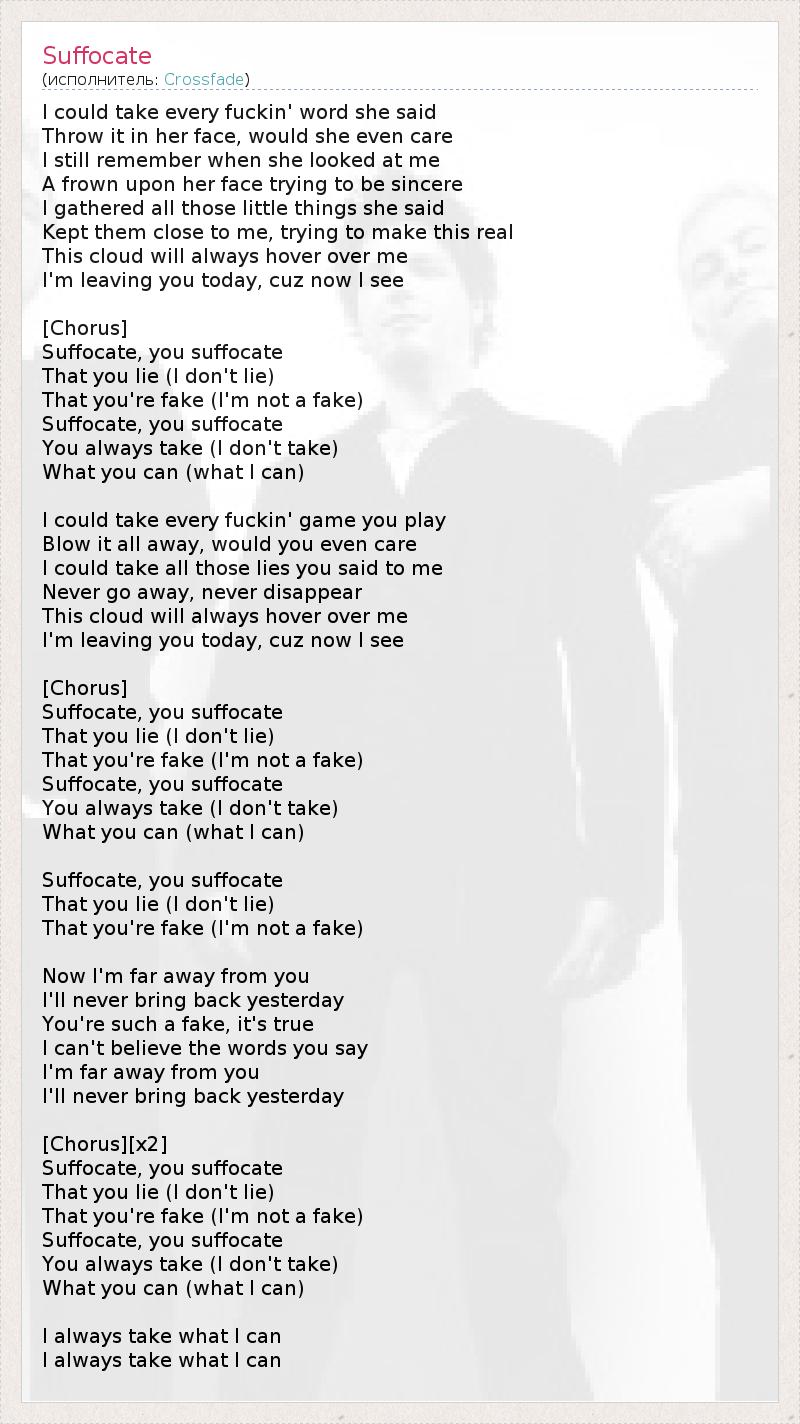 I could take every fuckin' word she said Throw it in her face, would she even care I still remember when she looked at me A frown upon her face trying to be sincere I gathered all those little things she said Kept them close to me, trying to make this real This cloud will always hover over me I'm leaving you today, cuz now I see [Chorus] Suffocate, you suffocate That you lie (I don't lie) That you're fake (I'm not a fake) Suffocate, you suffocate You always take (I don't take) What you can (what I can) I could take every fuckin' game you play Blow it all away, would you even care I could take all those lies you said to me Never go away, never disappear This cloud will always hover over me I'm leaving you today, cuz now I see [Chorus] Suffocate, you suffocate That you lie (I don't lie) That you're fake (I'm not a fake) Suffocate, you suffocate You always take (I don't take) What you can (what I can) Suffocate, you suffocate That you lie (I don't lie) That you're fake (I'm not a fake) Now I'm far away from you I'll never bring back yesterday You're such a fake, it's true I can't believe the words you say I'm far away from you I'll never bring back yesterday [Chorus][x2] Suffocate, you suffocate That you lie (I don't lie) That you're fake (I'm not a fake) Suffocate, you suffocate You always take (I don't take) What you can (what I can) I always take what I can I always take what I can
