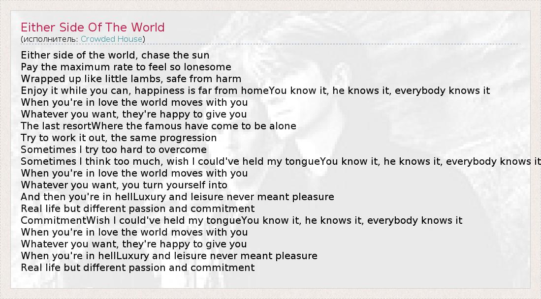 А как ты думаешь, о чем песня "Either Side Of The World" ?