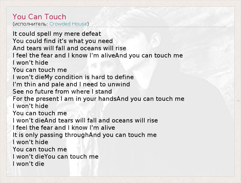 It could spell my mere defeat You could find it's what you need And tears will fall and oceans will rise I feel the fear and I know I'm aliveAnd you can touch me I won't hide You can touch me I won't dieMy condition is hard to define I'm thin and pale and I need to unwind See no future from where I stand For the present I am in your handsAnd you can touch me I won't hide You can touch me I won't dieAnd tears will fall and oceans will rise I feel the fear and I know I'm alive It is only passing throughAnd you can touch me I won't hide You can touch me I won't dieYou can touch me I won't die