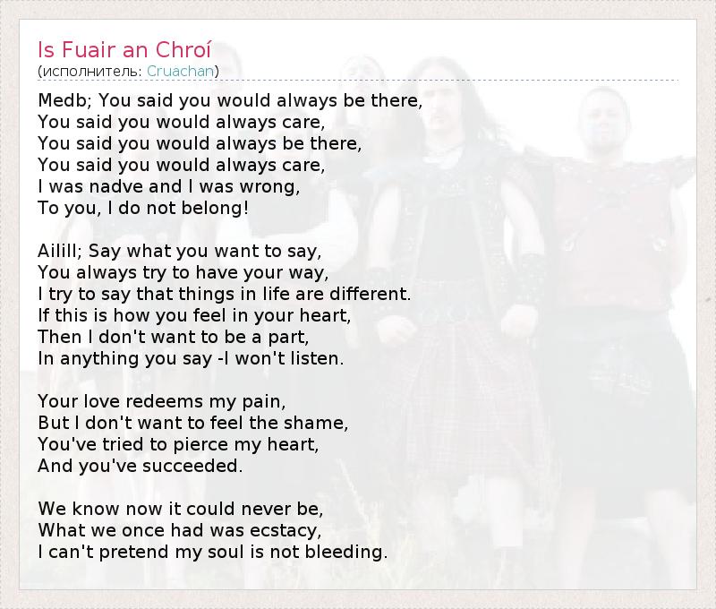 А как ты думаешь, о чем песня "Is Fuair an Chroí" ?