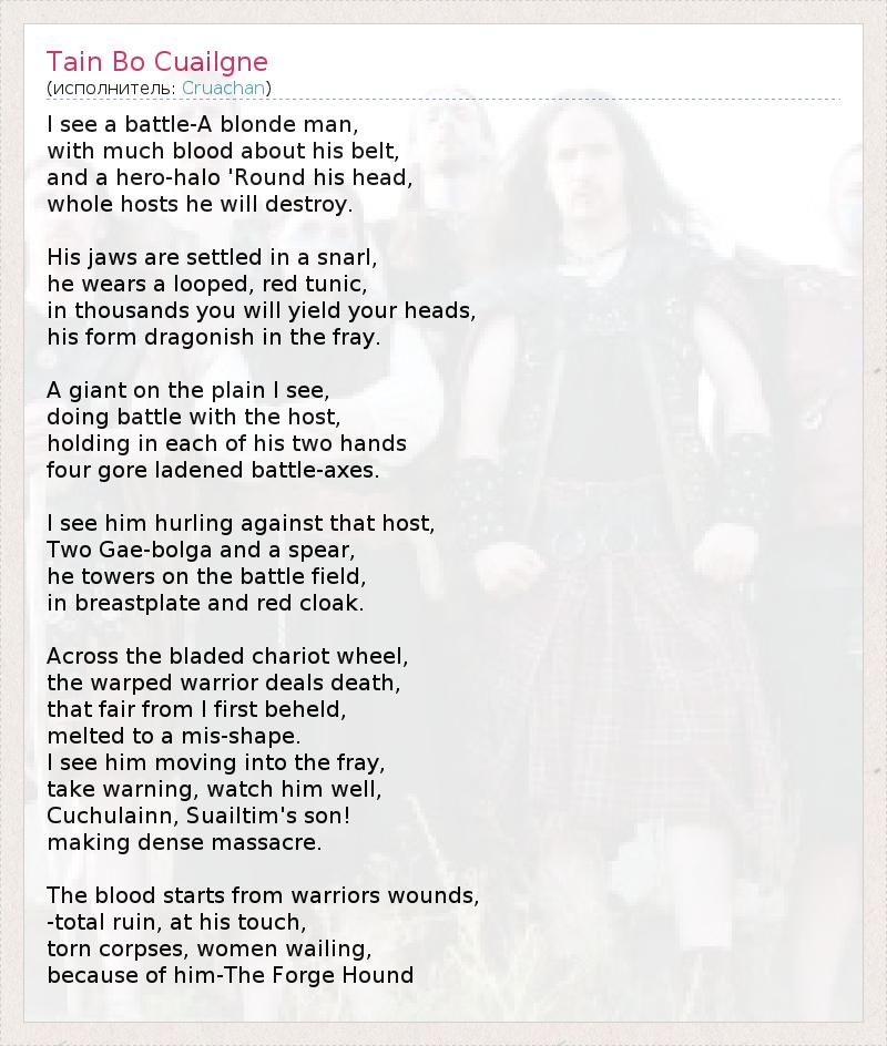 Примечания: В основе сюжета "Таин Бо Куальгне" – стремление Медб, королевы Коннахта, завладеть Донном Куальгне, огромным Бурым Быком из Ольстера, что объясняется тем, что ее муж, король Эйлилл, был хозяином Финнбенаха, Белорогого Быка из Коннахта, и лишь в этом превосходил жену по количеству богатств, которыми он владел. Ольстер считался традиционным соперником и врагом королевства Медб, и, чтобы завладеть вожделенным быком, королева собрала войско и вторглась в земли Ольстера. Перед вторжением Медб призвала Габалглину, пророчицу своего клана, чтобы та предсказала ей победу, но в ответ услышала то, о чем сказано в этой песне. В то время войны люди Ольстера не могли противостоять Медб, ибо Махой на них было наложено заклятие, и единственным воином, способным держать в руках оружие, оказался Кухулин. Он выступил против войска Медб, в одиночку сражаясь с ее бойцами, и задержал их на много недель. В конце концов Кухулин был убит, воины Коннахта захватили быка и угнали его в лагерь Медб. Где и состоялась эпическая битва Бурого Быка с Финнбенахом, продолжавшаяся день и ночь. В конце концов Белорогий Бык был убит и растерзан в клочки. Впоследствии Донн Куальгне возвратился в Ольстер, где и умер.