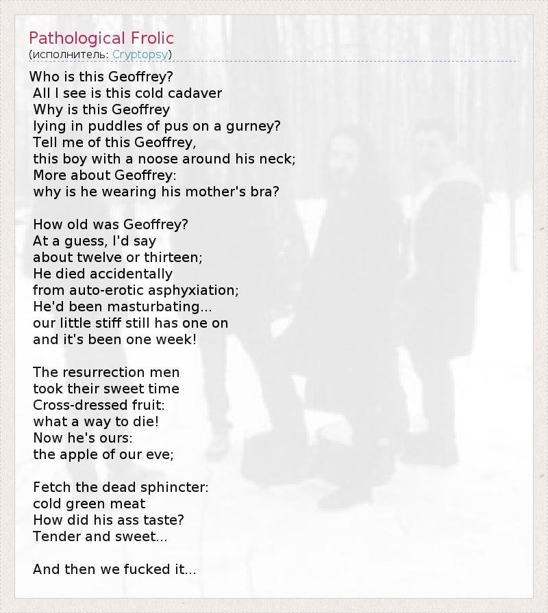 Who is this Geoffrey? All I see is this cold cadaver Why is this Geoffrey lying in puddles of pus on a gurney? Tell me of this Geoffrey, this boy with a noose around his neck; More about Geoffrey: why is he wearing his mother's bra? How old was Geoffrey? At a guess, I'd say about twelve or thirteen; He died accidentally from auto-erotic asphyxiation; He'd been masturbating... our little stiff still has one on and it's been one week! The resurrection men took their sweet time Cross-dressed fruit: what a way to die! Now he's ours: the apple of our eve; Fetch the dead sphincter: cold green meat How did his ass taste? Tender and sweet... And then we fucked it...