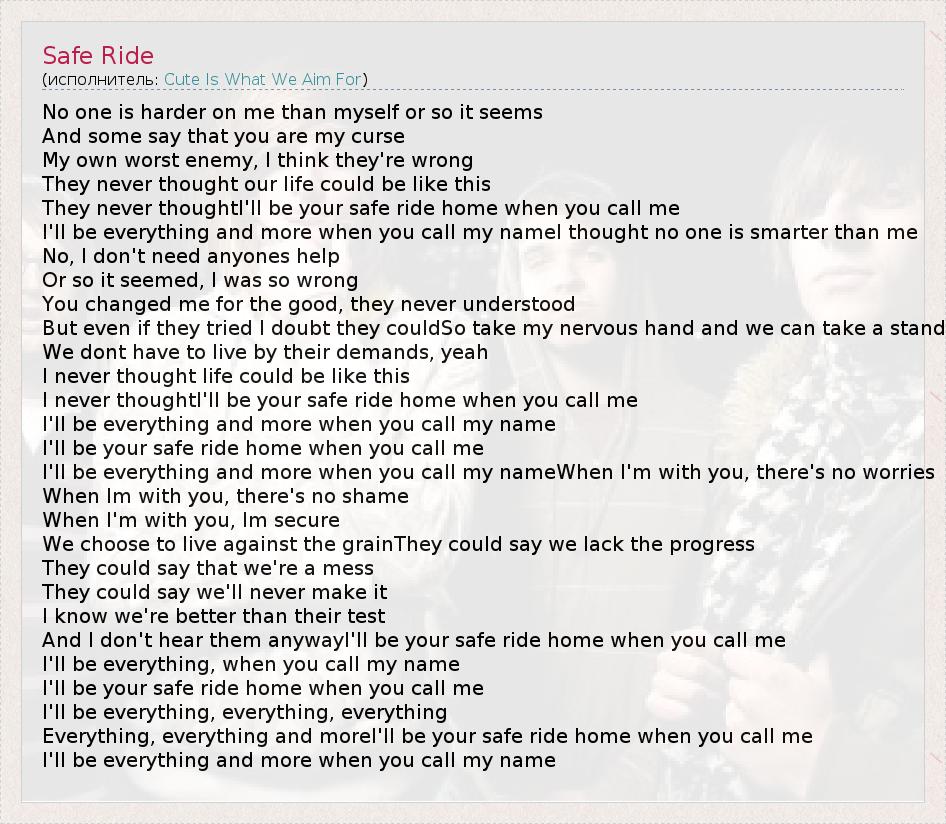 No one is harder on me than myself or so it seems And some say that you are my curse My own worst enemy, I think they're wrong They never thought our life could be like this They never thoughtI'll be your safe ride home when you call me I'll be everything and more when you call my nameI thought no one is smarter than me No, I don't need anyones help Or so it seemed, I was so wrong You changed me for the good, they never understood But even if they tried I doubt they couldSo take my nervous hand and we can take a stand We dont have to live by their demands, yeah I never thought life could be like this I never thoughtI'll be your safe ride home when you call me I'll be everything and more when you call my name I'll be your safe ride home when you call me I'll be everything and more when you call my nameWhen I'm with you, there's no worries When Im with you, there's no shame When I'm with you, Im secure We choose to live against the grainThey could say we lack the progress They could say that we're a mess They could say we'll never make it I know we're better than their test And I don't hear them anywayI'll be your safe ride home when you call me I'll be everything, when you call my name I'll be your safe ride home when you call me I'll be everything, everything, everything Everything, everything and moreI'll be your safe ride home when you call me I'll be everything and more when you call my name