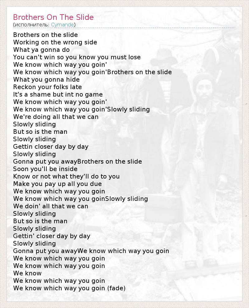 Brothers on the slide Working on the wrong side What ya gonna do You can't win so you know you must lose We know which way you goin' We know which way you goin'Brothers on the slide What you gonna hide Reckon your folks late It's a shame but int no game We know which way you goin' We know which way you goin'Slowly sliding We're doing all that we can Slowly sliding But so is the man Slowly sliding Gettin closer day by day Slowly sliding Gonna put you awayBrothers on the slide Soon you'll be inside Know or not what they'll do to you Make you pay up all you due We know which way you goin We know which way you goinSlowly sliding We doin' all that we can Slowly sliding But so is the man Slowly sliding Gettin' closer day by day Slowly sliding Gonna put you awayWe know which way you goin We know which way you goin We know which way you goin We know We know which way you goin We know which way you goin (fade)