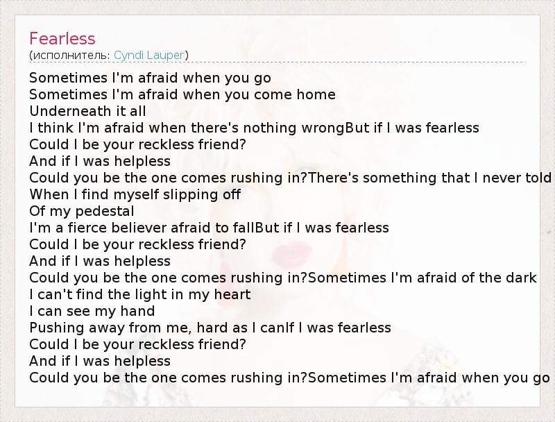 Sometimes I'm afraid when you go Sometimes I'm afraid when you come home Underneath it all I think I'm afraid when there's nothing wrongBut if I was fearless Could I be your reckless friend? And if I was helpless Could you be the one comes rushing in?There's something that I never told When I find myself slipping off Of my pedestal I'm a fierce believer afraid to fallBut if I was fearless Could I be your reckless friend? And if I was helpless Could you be the one comes rushing in?Sometimes I'm afraid of the dark I can't find the light in my heart I can see my hand Pushing away from me, hard as I canIf I was fearless Could I be your reckless friend? And if I was helpless Could you be the one comes rushing in?Sometimes I'm afraid when you go