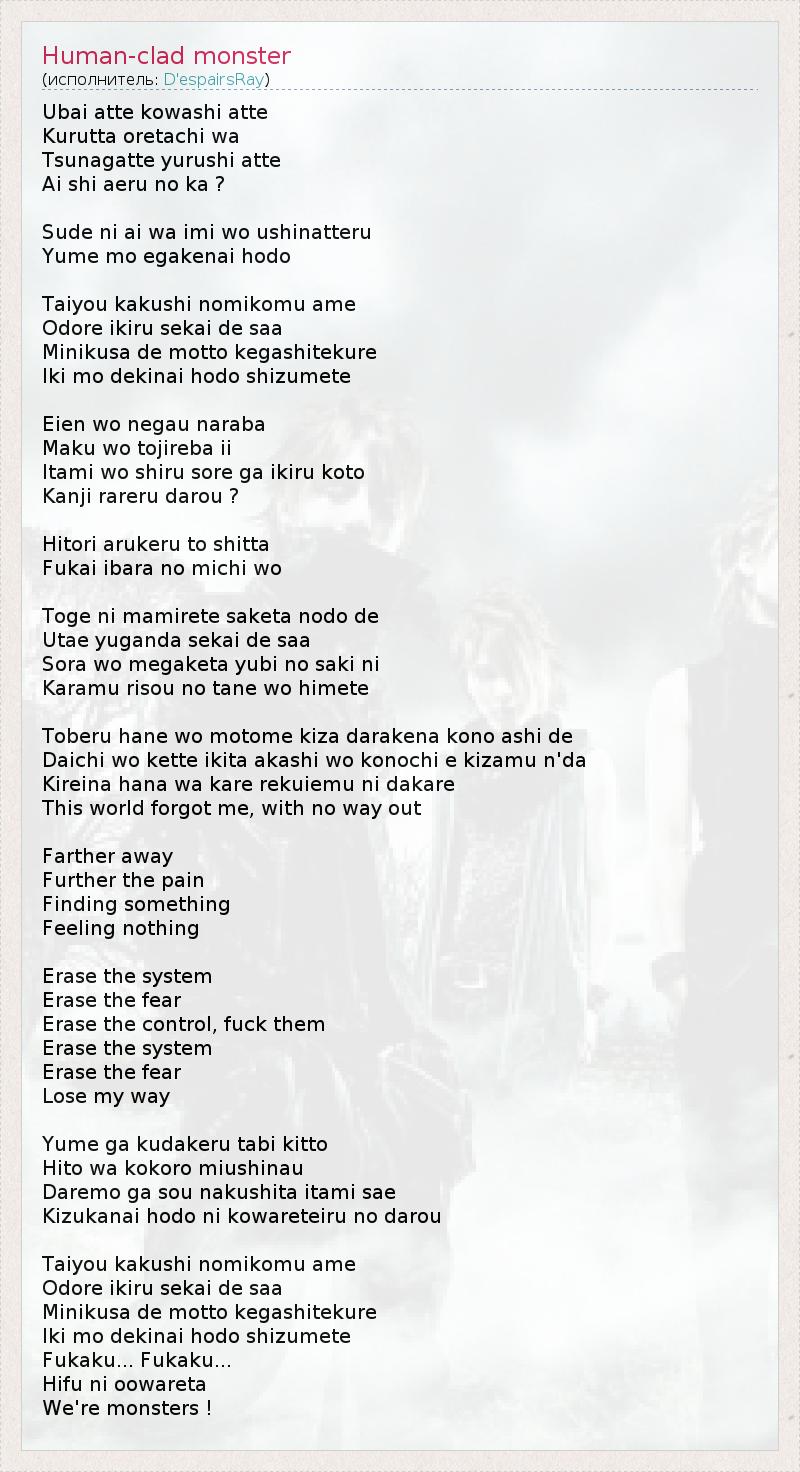 Ubai atte kowashi atte Kurutta oretachi wa Tsunagatte yurushi atte Ai shi aeru no ka ? Sude ni ai wa imi wo ushinatteru Yume mo egakenai hodo Taiyou kakushi nomikomu ame Odore ikiru sekai de saa Minikusa de motto kegashitekure Iki mo dekinai hodo shizumete Eien wo negau naraba Maku wo tojireba ii Itami wo shiru sore ga ikiru koto Kanji rareru darou ? Hitori arukeru to shitta Fukai ibara no michi wo Toge ni mamirete saketa nodo de Utae yuganda sekai de saa Sora wo megaketa yubi no saki ni Karamu risou no tane wo himete Toberu hane wo motome kiza darakena kono ashi de Daichi wo kette ikita akashi wo konochi e kizamu n'da Kireina hana wa kare rekuiemu ni dakare This world forgot me, with no way out Farther away Further the pain Finding something Feeling nothing Erase the system Erase the fear Erase the control, fuck them Erase the system Erase the fear Lose my way Yume ga kudakeru tabi kitto Hito wa kokoro miushinau Daremo ga sou nakushita itami sae Kizukanai hodo ni kowareteiru no darou Taiyou kakushi nomikomu ame Odore ikiru sekai de saa Minikusa de motto kegashitekure Iki mo dekinai hodo shizumete Fukaku... Fukaku... Hifu ni oowareta We're monsters !