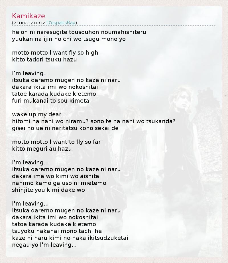 heion ni naresugite tousouhon noumahishiteru yuukan na ijin no chi wo tsugu mono yo motto motto I want fly so high kitto tadori tsuku hazu I'm leaving... itsuka daremo mugen no kaze ni naru dakara ikita imi wo nokoshitai tatoe karada kudake kietemo furi mukanai to sou kimeta wake up my dear... hitomi ha nani wo niramu? sono te ha nani wo tsukanda? gisei no ue ni naritatsu kono sekai de motto motto I want to fly so far kitto meguri au hazu I'm leaving... itsuka daremo mugen no kaze ni naru dakara ima wo kimi wo aishitai nanimo kamo ga uso ni mietemo shinjiteiyou kimi dake wo I'm leaving... itsuka daremo mugen no kaze ni naru dakara ikita imi wo nokoshitai tatoe karada kudake kietemo tsuyoku hakanai mono tachi he kaze ni naru kimi no naka ikitsudzuketai negau yo I'm leaving...