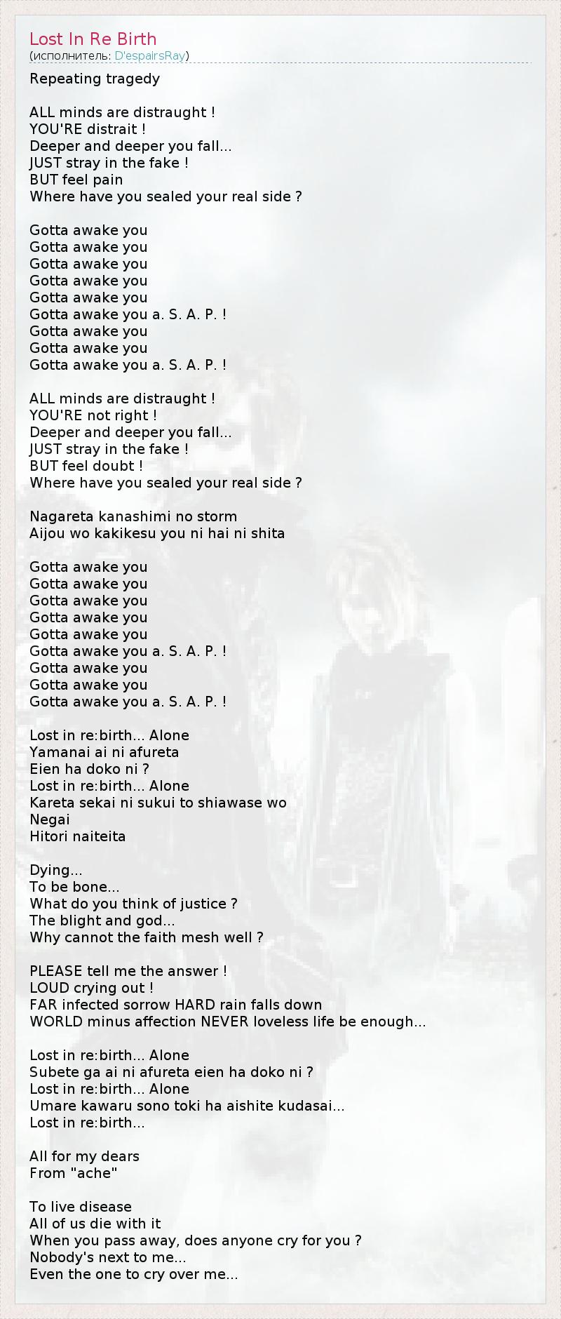 Repeating tragedy ALL minds are distraught ! YOU'RE distrait ! Deeper and deeper you fall... JUST stray in the fake ! BUT feel pain Where have you sealed your real side ? Gotta awake you Gotta awake you Gotta awake you Gotta awake you Gotta awake you Gotta awake you a. S. A. P. ! Gotta awake you Gotta awake you Gotta awake you a. S. A. P. ! ALL minds are distraught ! YOU'RE not right ! Deeper and deeper you fall... JUST stray in the fake ! BUT feel doubt ! Where have you sealed your real side ? Nagareta kanashimi no storm Aijou wo kakikesu you ni hai ni shita Gotta awake you Gotta awake you Gotta awake you Gotta awake you Gotta awake you Gotta awake you a. S. A. P. ! Gotta awake you Gotta awake you Gotta awake you a. S. A. P. ! Lost in re:birth... Alone Yamanai ai ni afureta Eien ha doko ni ? Lost in re:birth... Alone Kareta sekai ni sukui to shiawase wo Negai Hitori naiteita Dying... To be bone... What do you think of justice ? The blight and god... Why cannot the faith mesh well ? PLEASE tell me the answer ! LOUD crying out ! FAR infected sorrow HARD rain falls down WORLD minus affection NEVER loveless life be enough... Lost in re:birth... Alone Subete ga ai ni afureta eien ha doko ni ? Lost in re:birth... Alone Umare kawaru sono toki ha aishite kudasai... Lost in re:birth... All for my dears From "ache" To live disease All of us die with it When you pass away, does anyone cry for you ? Nobody's next to me... Even the one to cry over me...