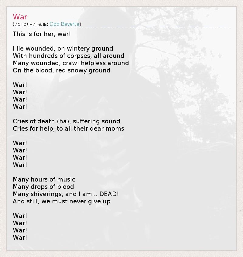This is for her, war! I lie wounded, on wintery ground With hundreds of corpses, all around Many wounded, crawl helpless around On the blood, red snowy ground War! War! War! War! Cries of death (ha), suffering sound Cries for help, to all their dear moms War! War! War! War! Many hours of music Many drops of blood Many shiverings, and I am... DEAD! And still, we must never give up War! War! War! War!