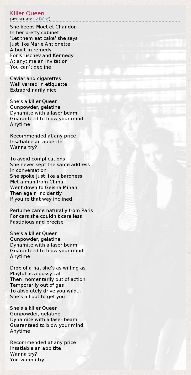 She keeps Moet et Chandon In her pretty cabinet 'Let them eat cake' she says Just like Marie Antionette A built-in remedy For Kruschev and Kennedy At anytime an invitation You can't decline Caviar and cigarettes Well versed in etiquette Extraordinarily nice She's a killer Queen Gunpowder, gelatine Dynamite with a laser beam Guaranteed to blow your mind Anytime Recommended at any price Insatiable an appetite Wanna try? To avoid complications She never kept the same address In conversation She spoke just like a baroness Met a man from China Went down to Geisha Minah Then again incidently If you're that way inclined Perfume came naturally from Paris For cars she couldn't care less Fastidious and precise She's a killer Queen Gunpowder, gelatine Dynamite with a laser beam Guaranteed to blow your mind Anytime Drop of a hat she's as willing as Playful as a pussy cat Then momentarily out of action Temporarily out of gas To absolutely drive you wild... She's all out to get you She's a killer Queen Gunpowder, gelatine Dynamite with a laser beam Guaranteed to blow your mind Anytime Recommended at any price Insatiable an appitite Wanna try? You wanna try...