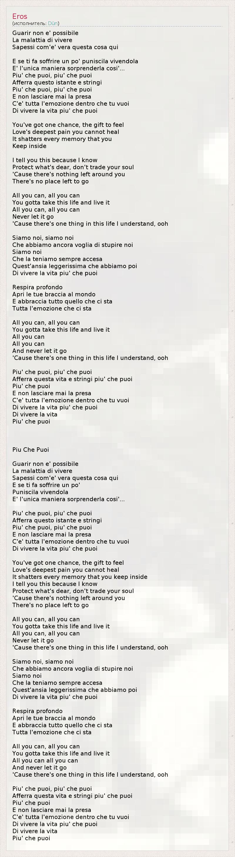 Guarir non e' possibile La malattia di vivere Sapessi com'e' vera questa cosa qui E se ti fa soffrire un po' puniscila vivendola E' l'unica maniera sorprenderla cosi'... Piu' che puoi, piu' che puoi Afferra questo istante e stringi Piu' che puoi, piu' che puoi E non lasciare mai la presa C'e' tutta l'emozione dentro che tu vuoi Di vivere la vita piu' che puoi You've got one chance, the gift to feel Love's deepest pain you cannot heal It shatters every memory that you Keep inside I tell you this because I know Protect what's dear, don't trade your soul 'Cause there's nothing left around you There's no place left to go All you can, all you can You gotta take this life and live it All you can, all you can Never let it go 'Cause there's one thing in this life I understand, ooh Siamo noi, siamo noi Che abbiamo ancora voglia di stupire noi Siamo noi Che la teniamo sempre accesa Quest'ansia leggerissima che abbiamo poi Di vivere la vita piu' che puoi Respira profondo Apri le tue braccia al mondo E abbraccia tutto quello che ci sta Tutta l'emozione che ci sta All you can, all you can You gotta take this life and live it All you can All you can And never let it go 'Cause there's one thing in this life I understand, ooh Piu' che puoi, piu' che puoi Afferra questa vita e stringi piu' che puoi Piu' che puoi E non lasciare mai la presa C'e' tutta l'emozione dentro che tu vuoi Di vivere la vita piu' che puoi Di vivere la vita Piu' che puoi Piu Che Puoi Guarir non e' possibile La malattia di vivere Sapessi com'e' vera questa cosa qui E se ti fa soffrire un po' Puniscila vivendola E' l'unica maniera sorprenderla cosi'... Piu' che puoi, piu' che puoi Afferra questo istante e stringi Piu' che puoi, piu' che puoi E non lasciare mai la presa C'e' tutta l'emozione dentro che tu vuoi Di vivere la vita piu' che puoi You've got one chance, the gift to feel Love's deepest pain you cannot heal It shatters every memory that you keep inside I tell you this because I know Protect what's dear, don't trade your soul 'Cause there's nothing left around you There's no place left to go All you can, all you can You gotta take this life and live it All you can, all you can Never let it go 'Cause there's one thing in this life I understand, ooh Siamo noi, siamo noi Che abbiamo ancora voglia di stupire noi Siamo noi Che la teniamo sempre accesa Quest'ansia leggerissima che abbiamo poi Di vivere la vita piu' che puoi Respira profondo Apri le tue braccia al mondo E abbraccia tutto quello che ci sta Tutta l'emozione che ci sta All you can, all you can You gotta take this life and live it All you can all you can And never let it go 'Cause there's one thing in this life I understand, ooh Piu' che puoi, piu' che puoi Afferra questa vita e stringi piu' che puoi Piu' che puoi E non lasciare mai la presa C'e' tutta l'emozione dentro che tu vuoi Di vivere la vita piu' che puoi Di vivere la vita Piu' che puoi