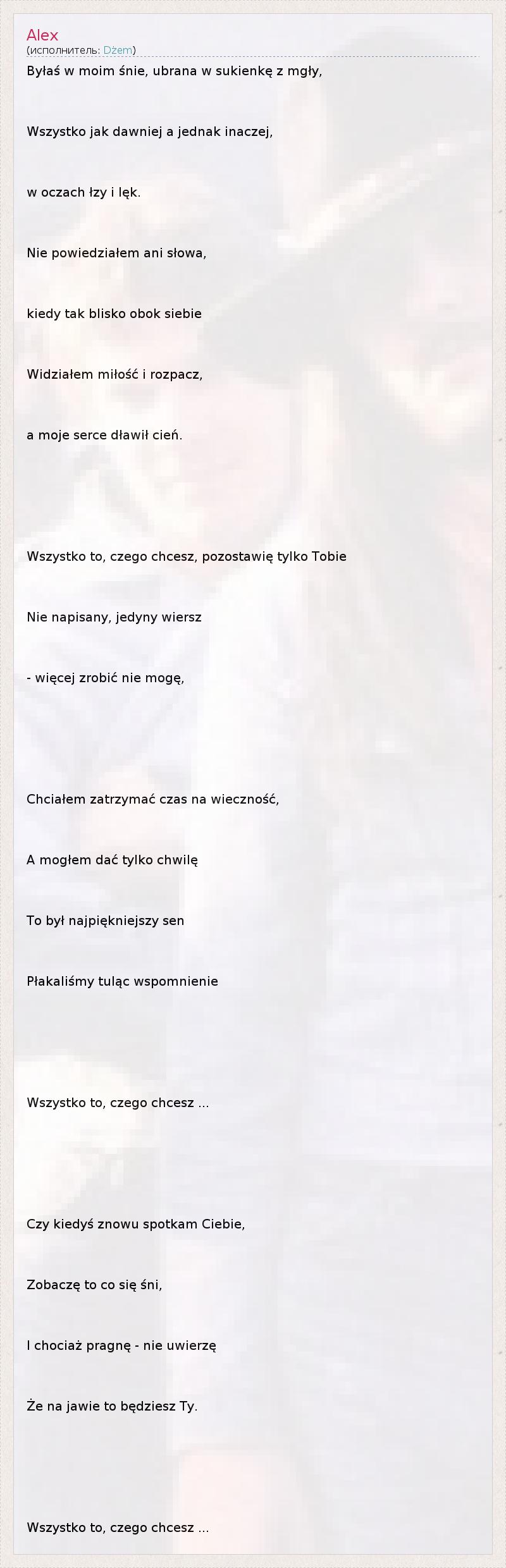 Byłaś w moim śnie, ubrana w sukienkę z mgły, Wszystko jak dawniej a jednak inaczej, w oczach łzy i lęk. Nie powiedziałem ani słowa, kiedy tak blisko obok siebie Widziałem miłość i rozpacz, a moje serce dławił cień. Wszystko to, czego chcesz, pozostawię tylko Tobie Nie napisany, jedyny wiersz - więcej zrobić nie mogę, Chciałem zatrzymać czas na wieczność, A mogłem dać tylko chwilę To był najpiękniejszy sen Płakaliśmy tuląc wspomnienie Wszystko to, czego chcesz ... Czy kiedyś znowu spotkam Ciebie, Zobaczę to co się śni, I chociaż pragnę - nie uwierzę Że na jawie to będziesz Ty. Wszystko to, czego chcesz ...