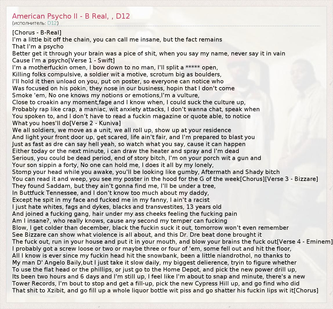 А как ты думаешь, о чем песня "American Psycho II - B Real, , D12" ?