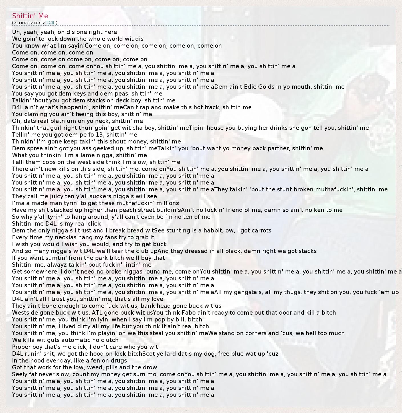 Uh, yeah, yeah, on dis one right here We goin' to lock down the whole world wit dis You know what I'm sayin'Come on, come on, come on, come on, come on Come on, come on, come on Come on, come on come on, come on, come on Come on, come on, come onYou shittin' me a, you shittin' me a, you shittin' me a, you shittin' me a You shittin' me a, you shittin' me a, you shittin' me a, you shittin' me a You shittin' me a, you shittin' me a, you shittin' me a, you shittin' me a You shittin' me a, you shittin' me a, you shittin' me a, you shittin' me aDem ain't Edie Golds in yo mouth, shittin' me You say you got dem keys and dem peas, shittin' me Talkin' 'bout you got dem stacks on deck boy, shittin' me D4L ain't what's happenin', shittin' meCan't rap and make this hot track, shittin me You claming you ain't feeing this boy, shittin' me Oh, dats real platnium on yo neck, shittin' me Thinkin' that gurl right thurr goin' get wit cha boy, shittin' meTipin' house you buying her drinks she gon tell you, shittin' me Tellin' me you got dem pe fo 13, shittin' me Thinkin' I'm gone keep takin' this shout money, shittin' me Dem spree ain't got you ass geeked up, shittin' meTalkin' you 'bout want yo money back partner, shittin' me What you thinkin' I'm a lame nigga, shittin' me Telll them cops on the west side think I'm slow, shittin' me There ain't new kills on this side, shittin' me, come onYou shittin' me a, you shittin' me a, you shittin' me a, you shittin' me a You shittin' me a, you shittin' me a, you shittin' me a, you shittin' me a You shittin' me a, you shittin' me a, you shittin' me a, you shittin' me a You shittin' me a, you shittin' me a, you shittin' me a, you shittin' me aThey talkin' 'bout the stunt broken muthafuckin', shittin' me They call me juicy ten y'all suckers nigga's will see I'ma a made man tyrin' to get these muthafuckin' millions Have my shit stacked up higher than peach street buildin'sAin't no fuckin' friend of me, damn so ain't no ken to me So why y'all tyrin' to hang around, y'all can't even be fin no ten of me Shittin' me D4L is my real click Dem the only nigga's I trust and I break bread witSee stunting is a habbit, ow, I got carrots Every time my necklas hang my fans try to grab it I wish you would I wish you would, and try to get buck And so many nigga's wit D4L we'll tear the club upAnd they dreesed in all black, damn right we got stacks If you want sumtin' from the park bitch we'll buy that Shittin' me, alwayz talkin' bout fuckin' lintin' me Get somewhere, I don't need no broke niggas round me, come onYou shittin' me a, you shittin' me a, you shittin' me a, you shittin' me a You shittin' me a, you shittin' me a, you shittin' me a, you shittin' me a You shittin' me a, you shittin' me a, you shittin' me a, you shittin' me a You shittin' me a, you shittin' me a, you shittin' me a, you shittin' me aAll my gangsta's, all my thugs, they shit on you, you fuck 'em up D4L ain't all I trust you, shittin' me, that's all my love They ain't bone enough to come fuck wit us, bank head gone buck wit us Westside gone buck wit us, ATL gone buck wit usYou think Fabo ain't ready to come out that door and kill a bitch You shittin' me, you think I'm lyin' when I say I'm pop by bill, bitch You shittin' me, I lived dirty all my life but you think it ain't real bitch You shittin' me, you think I'm playin' oh we this steal you shittin' meWe stand on corners and 'cus, we hell too much We killa wit guts automatic no clutch Proper boy that's me click, I don't care who you wit D4L runin' shit, we got the hood on lock bitchScot ye lard dat's my dog, free blue wat up 'cuz In the hood ever day, like a fen on drugs Got that work for the low, weed, pills and the drow Seely fat never slow, count my money get sum mo, come onYou shittin' me a, you shittin' me a, you shittin' me a, you shittin' me a You shittin' me a, you shittin' me a, you shittin' me a, you shittin' me a You shittin' me a, you shittin' me a, you shittin' me a, you shittin' me a You shittin' me a, you shittin' me a, you shittin' me a, you shittin' me a