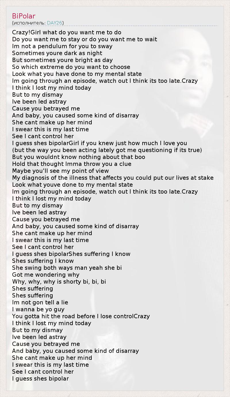 Crazy!Girl what do you want me to do Do you want me to stay or do you want me to wait Im not a pendulum for you to sway Sometimes youre dark as night But sometimes youre bright as day So which extreme do you want to choose Look what you have done to my mental state Im going through an episode, watch out I think its too late.Crazy I think I lost my mind today But to my dismay Ive been led astray Cause you betrayed me And baby, you caused some kind of disarray She cant make up her mind I swear this is my last time See I cant control her I guess shes bipolarGirl if you knew just how much I love you (but the way you been acting lately got me questioning if its true) But you wouldnt know nothing about that boo Hold that thought Imma throw you a clue Maybe you'll see my point of view My diagnosis of the illness that affects you could put our lives at stake Look what youve done to my mental state Im going through an episode, watch out I think its too late.Crazy I think I lost my mind today But to my dismay Ive been led astray Cause you betrayed me And baby, you caused some kind of disarray She cant make up her mind I swear this is my last time See I cant control her I guess shes bipolarShes suffering I know Shes suffering I know She swing both ways man yeah she bi Got me wondering why Why, why, why is shorty bi, bi, bi Shes suffering Shes suffering Im not gon tell a lie I wanna be yo guy You gotta hit the road before I lose controlCrazy I think I lost my mind today But to my dismay Ive been led astray Cause you betrayed me And baby, you caused some kind of disarray She cant make up her mind I swear this is my last time See I cant control her I guess shes bipolar