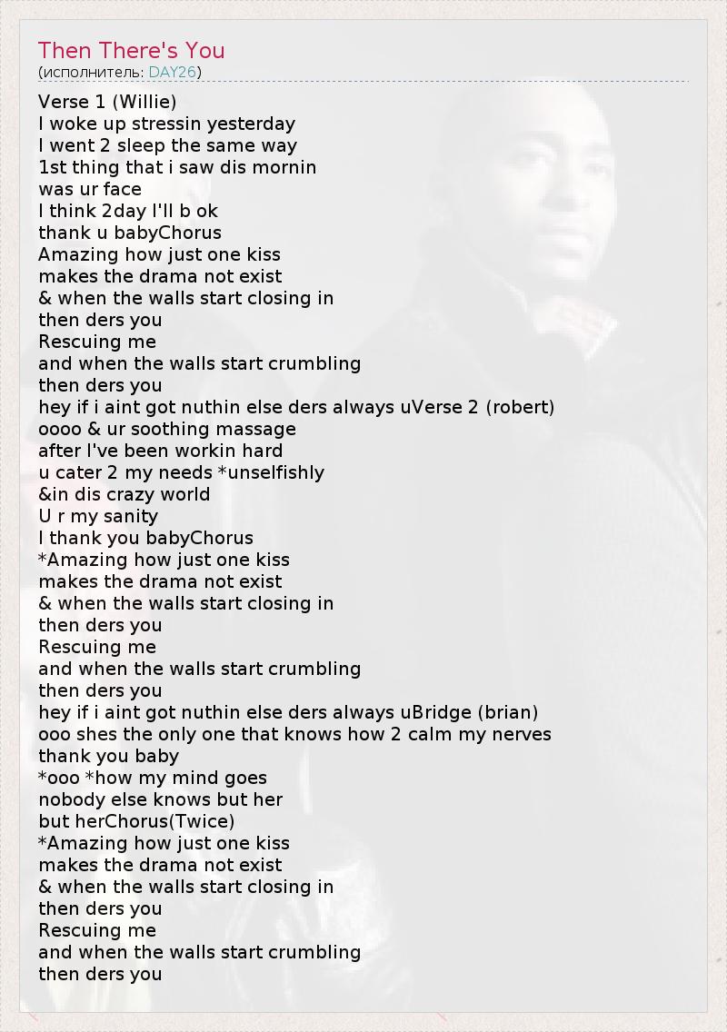 Verse 1 (Willie) I woke up stressin yesterday I went 2 sleep the same way 1st thing that i saw dis mornin was ur face I think 2day I'll b ok thank u babyChorus Amazing how just one kiss makes the drama not exist & when the walls start closing in then ders you Rescuing me and when the walls start crumbling then ders you hey if i aint got nuthin else ders always uVerse 2 (robert) oooo & ur soothing massage after I've been workin hard u cater 2 my needs *unselfishly &in dis crazy world U r my sanity I thank you babyChorus *Amazing how just one kiss makes the drama not exist & when the walls start closing in then ders you Rescuing me and when the walls start crumbling then ders you hey if i aint got nuthin else ders always uBridge (brian) ooo shes the only one that knows how 2 calm my nerves thank you baby *ooo *how my mind goes nobody else knows but her but herChorus(Twice) *Amazing how just one kiss makes the drama not exist & when the walls start closing in then ders you Rescuing me and when the walls start crumbling then ders you
