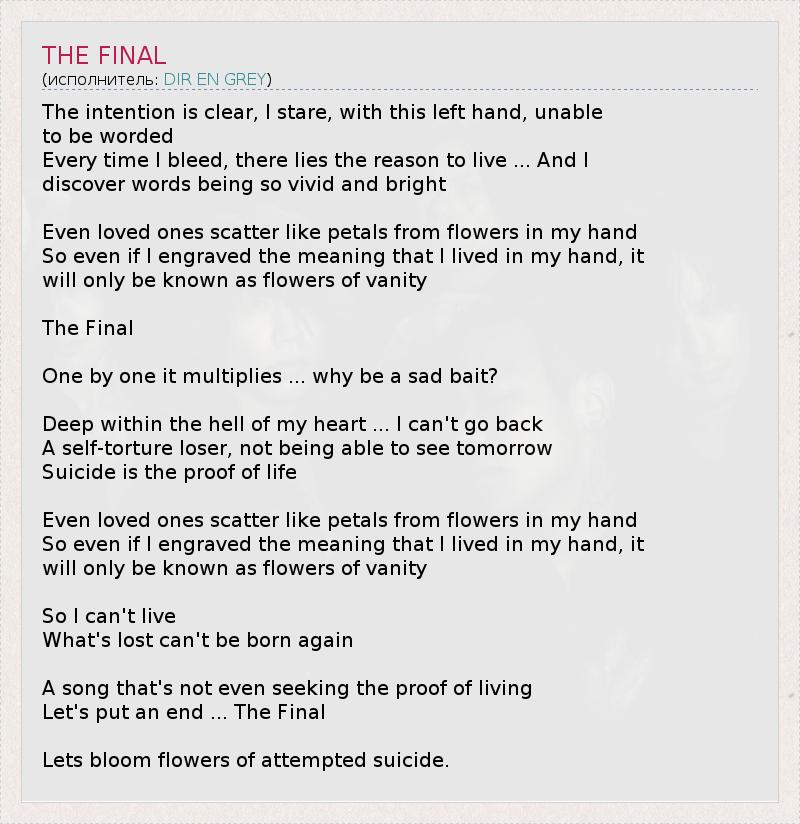 The intention is clear, I stare, with this left hand, unable to be worded Every time I bleed, there lies the reason to live ... And I discover words being so vivid and bright Even loved ones scatter like petals from flowers in my hand So even if I engraved the meaning that I lived in my hand, it will only be known as flowers of vanity The Final One by one it multiplies ... why be a sad bait? Deep within the hell of my heart ... I can't go back A self-torture loser, not being able to see tomorrow Suicide is the proof of life Even loved ones scatter like petals from flowers in my hand So even if I engraved the meaning that I lived in my hand, it will only be known as flowers of vanity So I can't live What's lost can't be born again A song that's not even seeking the proof of living Let's put an end ... The Final Lets bloom flowers of attempted suicide.