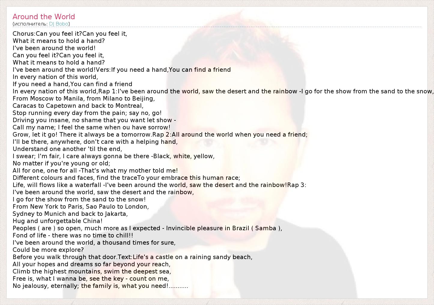 Chorus:Can you feel it?Can you feel it, What it means to hold a hand? I've been around the world! Can you feel it?Can you feel it, What it means to hold a hand? I've been around the world!Vers:If you need a hand,You can find a friend In every nation of this world, If you need a hand,You can find a friend In every nation of this world,Rap 1:I've been around the world, saw the desert and the rainbow -I go for the show from the sand to the snow, From Moscow to Manila, from Milano to Beijing, Caracas to Capetown and back to Montreal, Stop running every day from the pain; say no, go! Driving you insane, no shame that you want let show - Call my name; I feel the same when ou have sorrow! Grow, let it go! There it always be a tomorrow.Rap 2:All around the world when you need a friend; I'll be there, anywhere, don't care with a helping hand, Understand one another 'til the end, I swear; I'm fair, I care always gonna be there -Black, white, yellow, No matter if you're young or old; All for one, one for all -That's what my mother told me! Different colours and faces, find the traceTo your embrace this human race; Life, will flows like a waterfall -I've been around the world, saw the desert and the rainbow!Rap 3: I've been around the world, saw the desert and the rainbow, I go for the show from the sand to the snow! From New York to Paris, Sao Paulo to London, Sydney to Munich and back to Jakarta, Hug and unforgettable China! Peoples ( are ) so open, much more as I expected - Invincible pleasure in Brazil ( Samba ), Fond of life - there was no time to chill!! I've been around the world, a thousand times for sure, Could be more explore? Before you walk through that door.Text:Life's a castle on a raining sandy beach, All your hopes and dreams so far beyond your reach, Climb the highest mountains, swim the deepest sea, Free is, what I wanna be, see the key - count on me, No jealousy, eternally; the family is, what you need!...........