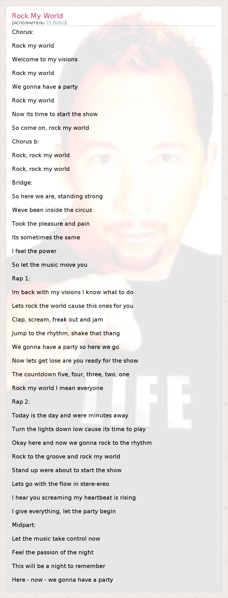 Это интересно:Настоящее имя DJ Bobo - Рене Бауманн.В 1984 году начал заниматься музыкой. Псевдоним DJ Bobo он взял в том же году. С 1985 года DJ Bobo работает диджеем. Через год он занимает второе место в швейцарском чемпионате диск-жокеев.Родился Рене 5 января 1968 года в местечке Кёлликен, что в Швейцарии. Рос он без отца (итальянца Луиджи Киприано), который покинул их семью, когда Рене было всего 2 года, оставив... продолжение