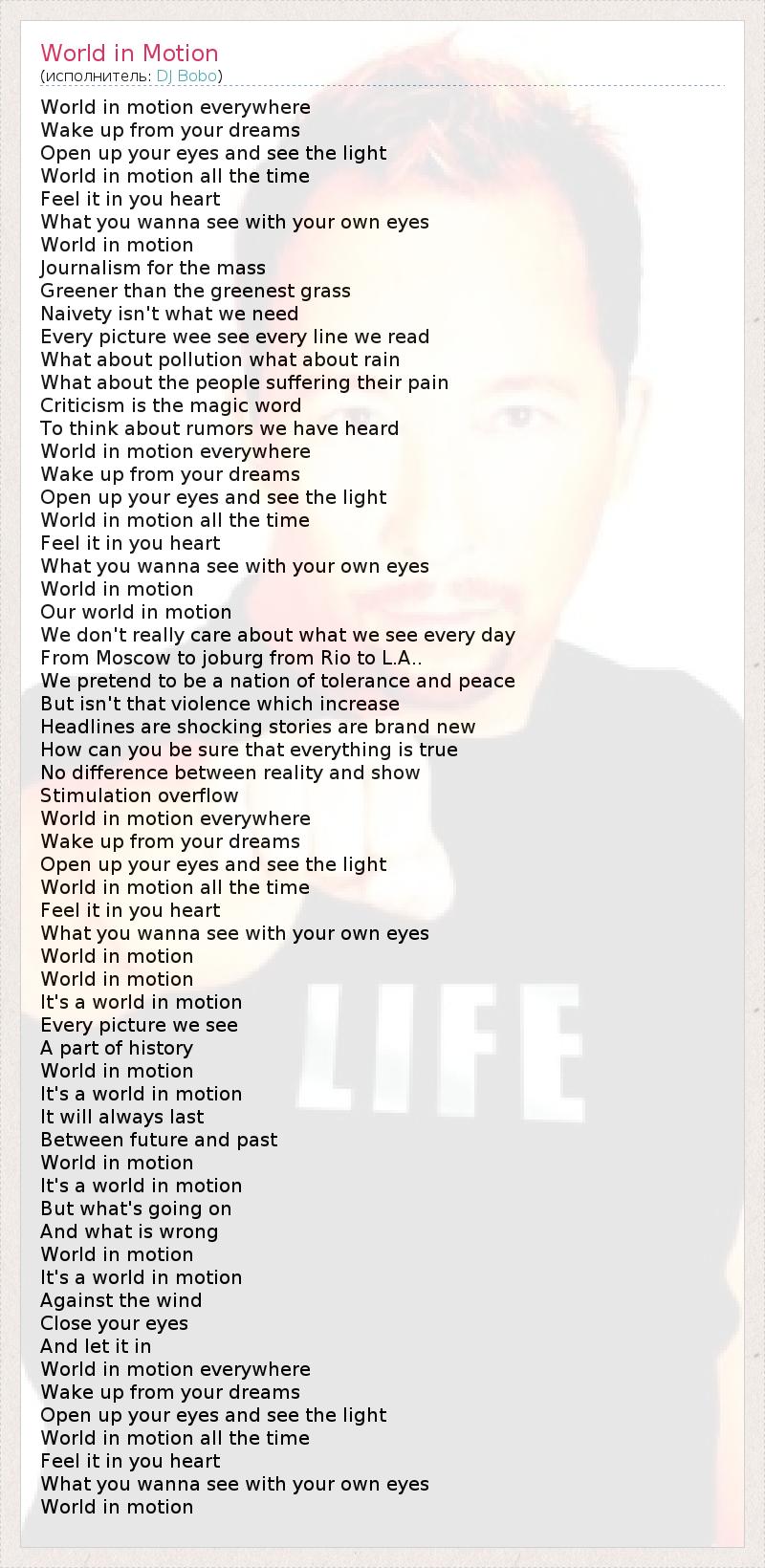 А как ты думаешь, о чем песня "World in Motion" ?