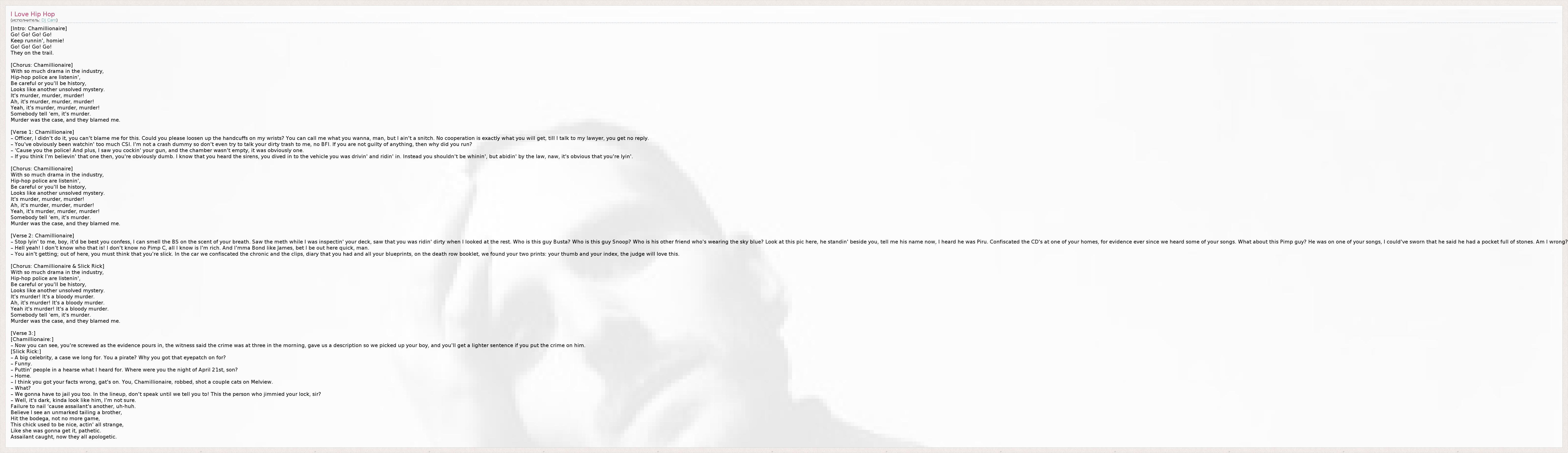 [Intro: Chamillionaire] Go! Go! Go! Go! Keep runnin', homie! Go! Go! Go! Go! They on the trail. [Chorus: Chamillionaire] With so much drama in the industry, Hip-hop police are listenin', Be careful or you'll be history, Looks like another unsolved mystery. It's murder, murder, murder! Ah, it's murder, murder, murder! Yeah, it's murder, murder, murder! Somebody tell ‘em, it's murder. Murder was the case, and they blamed me. [Verse 1: Chamillionaire] – Officer, I didn't do it, you can't blame me for this. Could you please loosen up the handcuffs on my wrists? You can call me what you wanna, man, but I ain't a snitch. No cooperation is exactly what you will get, till I talk to my lawyer, you get no reply. – You've obviously been watchin' too much CSI. I'm not a crash dummy so don't even try to talk your dirty trash to me, no BFI. If you are not guilty of anything, then why did you run? – ‘Cause you the police! And plus, I saw you cockin' your gun, and the chamber wasn't empty, it was obviously one. – If you think I'm believin' that one then, you're obviously dumb. I know that you heard the sirens, you dived in to the vehicle you was drivin' and ridin' in. Instead you shouldn't be whinin', but abidin' by the law, naw, it's obvious that you're lyin'. [Chorus: Chamillionaire] With so much drama in the industry, Hip-hop police are listenin', Be careful or you'll be history, Looks like another unsolved mystery. It's murder, murder, murder! Ah, it's murder, murder, murder! Yeah, it's murder, murder, murder! Somebody tell ‘em, it's murder. Murder was the case, and they blamed me. [Verse 2: Chamillionaire] – Stop lyin' to me, boy, it'd be best you confess, I can smell the BS on the scent of your breath. Saw the meth while I was inspectin' your deck, saw that you was ridin' dirty when I looked at the rest. Who is this guy Busta? Who is this guy Snoop? Who is his other friend who's wearing the sky blue? Look at this pic here, he standin' beside you, tell me his name now, I heard he was Piru. Confiscated the CD's at one of your homes, for evidence ever since we heard some of your songs. What about this Pimp guy? He was on one of your songs, I could've sworn that he said he had a pocket full of stones. Am I wrong? – Hell yeah! I don't know who that is! I don't know no Pimp C, all I know is I'm rich. And I'mma Bond like James, bet I be out here quick, man. – You ain't getting; out of here, you must think that you're slick. In the car we confiscated the chronic and the clips, diary that you had and all your blueprints, on the death row booklet, we found your two prints: your thumb and your index, the judge will love this. [Chorus: Chamillionaire & Slick Rick] With so much drama in the industry, Hip-hop police are listenin', Be careful or you'll be history, Looks like another unsolved mystery. It's murder! It's a bloody murder. Ah, it's murder! It's a bloody murder. Yeah it's murder! It's a bloody murder. Somebody tell ‘em, it's murder. Murder was the case, and they blamed me. [Verse 3:] [Chamillionaire:] – Now you can see, you're screwed as the evidence pours in, the witness said the crime was at three in the morning, gave us a description so we picked up your boy, and you'll get a lighter sentence if you put the crime on him. [Slick Rick:] – A big celebrity, a case we long for. You a pirate? Why you got that eyepatch on for? – Funny. – Puttin' people in a hearse what I heard for. Where were you the night of April 21st, son? – Home. – I think you got your facts wrong, gat's on. You, Chamillionaire, robbed, shot a couple cats on Melview. – What? – We gonna have to jail you too. In the lineup, don't speak until we tell you to! This the person who jimmied your lock, sir? – Well, it's dark, kinda look like him, I'm not sure. Failure to nail ‘cause assailant's another, uh-huh. Believe I see an unmarked tailing a brother, Hit the bodega, not no more game, This chick used to be nice, actin' all strange, Like she was gonna get it, pathetic. Assailant caught, now they all apologetic.