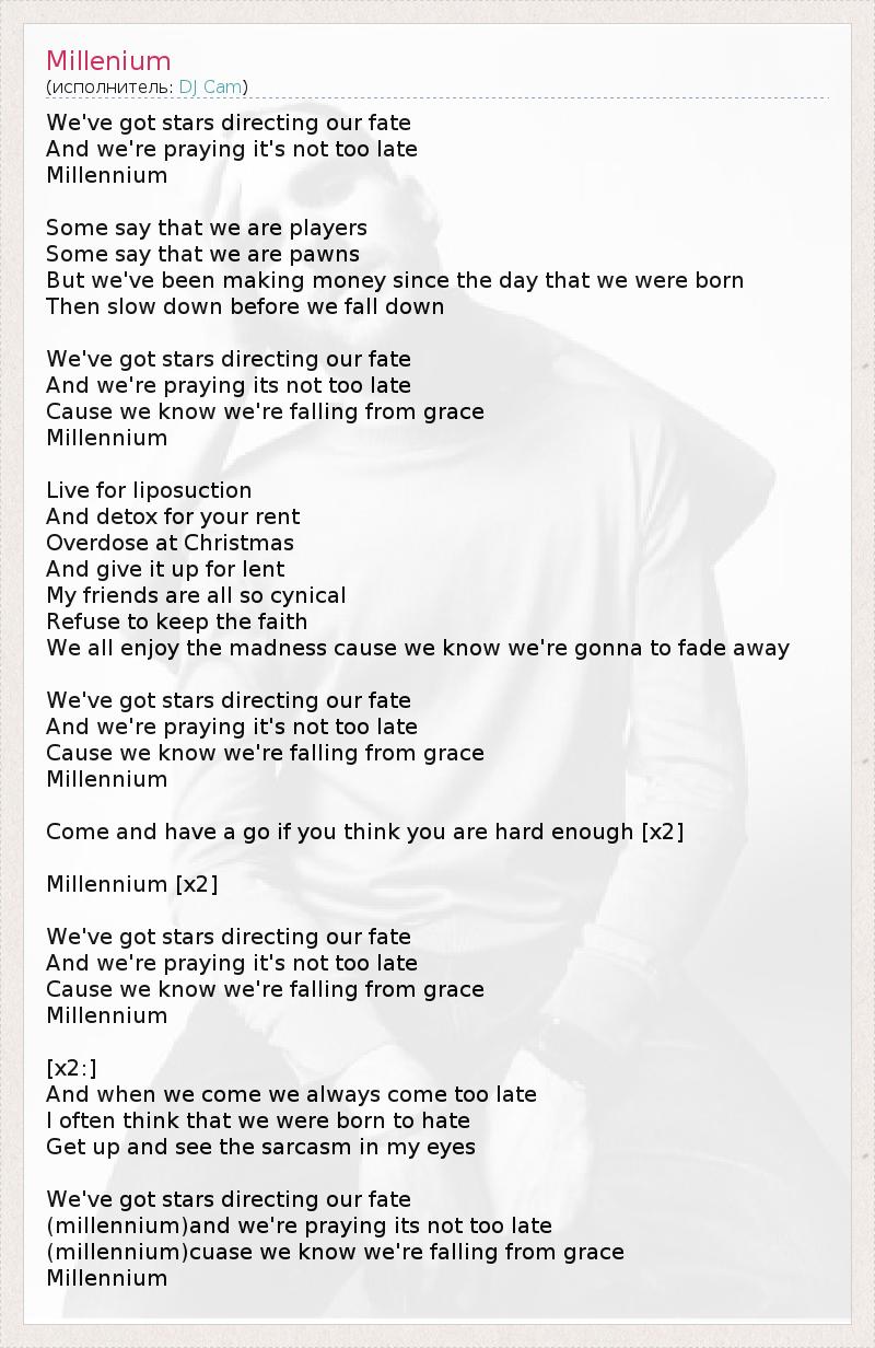 We've got stars directing our fate And we're praying it's not too late Millennium Some say that we are players Some say that we are pawns But we've been making money since the day that we were born Then slow down before we fall down We've got stars directing our fate And we're praying its not too late Cause we know we're falling from grace Millennium Live for liposuction And detox for your rent Overdose at Christmas And give it up for lent My friends are all so cynical Refuse to keep the faith We all enjoy the madness cause we know we're gonna to fade away We've got stars directing our fate And we're praying it's not too late Cause we know we're falling from grace Millennium Come and have a go if you think you are hard enough [x2] Millennium [x2] We've got stars directing our fate And we're praying it's not too late Cause we know we're falling from grace Millennium [x2:] And when we come we always come too late I often think that we were born to hate Get up and see the sarcasm in my eyes We've got stars directing our fate (millennium)and we're praying its not too late (millennium)cuase we know we're falling from grace Millennium