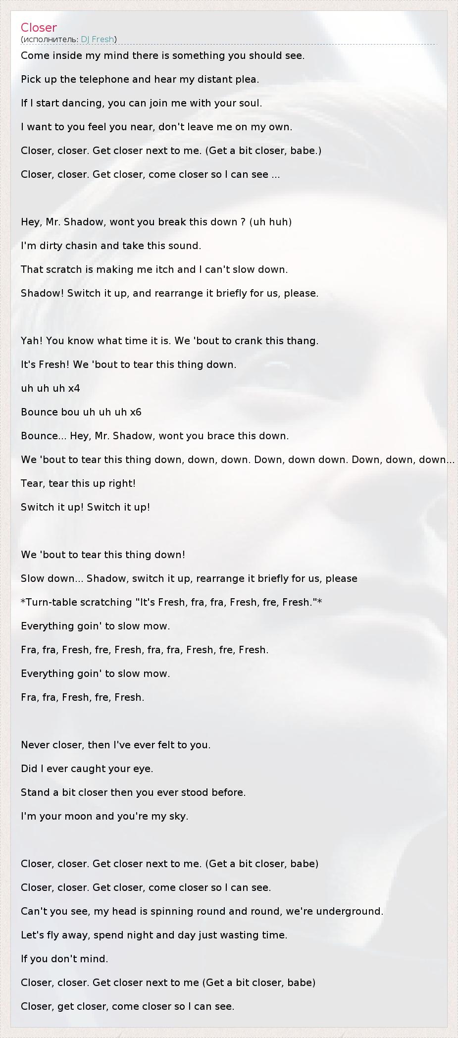Это интересно:Fresh как истинный британец крайне вежлив, спокоен и тихо говорит, но его ярко зеленые глаза пылают огнем как у тигра в поэме Уильяма Блэйка. Создатель самых сумасшедших мелодий и ритмов скрывает зверя, живущего в нем, за маской тихого человека. DJ Fresh, ака Dan Stein – 36-летний музыкант, удостоенный звания Best Producer на престижном Knowledge Drum&Bass Awards в 2003 году. Он уже вписал свое имя в историю drum&bass... продолжение