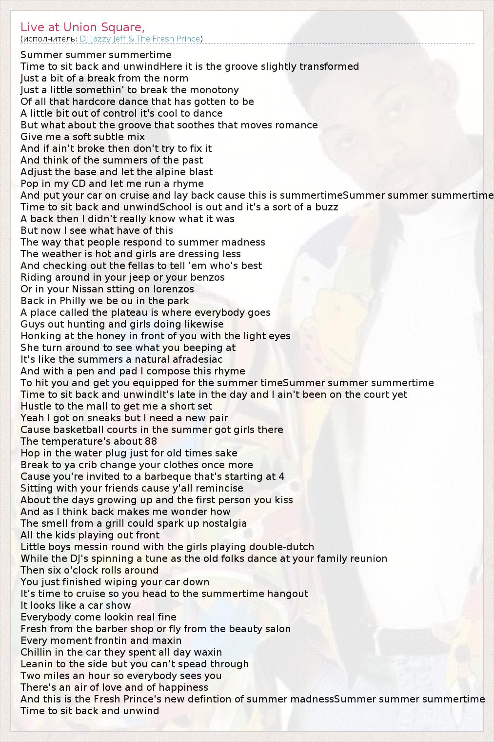 Summer summer summertime Time to sit back and unwindHere it is the groove slightly transformed Just a bit of a break from the norm Just a little somethin' to break the monotony Of all that hardcore dance that has gotten to be A little bit out of control it's cool to dance But what about the groove that soothes that moves romance Give me a soft subtle mix And if ain't broke then don't try to fix it And think of the summers of the past Adjust the base and let the alpine blast Pop in my CD and let me run a rhyme And put your car on cruise and lay back cause this is summertimeSummer summer summertime Time to sit back and unwindSchool is out and it's a sort of a buzz A back then I didn't really know what it was But now I see what have of this The way that people respond to summer madness The weather is hot and girls are dressing less And checking out the fellas to tell 'em who's best Riding around in your jeep or your benzos Or in your Nissan stting on lorenzos Back in Philly we be ou in the park A place called the plateau is where everybody goes Guys out hunting and girls doing likewise Honking at the honey in front of you with the light eyes She turn around to see what you beeping at It's like the summers a natural afradesiac And with a pen and pad I compose this rhyme To hit you and get you equipped for the summer timeSummer summer summertime Time to sit back and unwindIt's late in the day and I ain't been on the court yet Hustle to the mall to get me a short set Yeah I got on sneaks but I need a new pair Cause basketball courts in the summer got girls there The temperature's about 88 Hop in the water plug just for old times sake Break to ya crib change your clothes once more Cause you're invited to a barbeque that's starting at 4 Sitting with your friends cause y'all remincise About the days growing up and the first person you kiss And as I think back makes me wonder how The smell from a grill could spark up nostalgia All the kids playing out front Little boys messin round with the girls playing double-dutch While the DJ's spinning a tune as the old folks dance at your family reunion Then six o'clock rolls around You just finished wiping your car down It's time to cruise so you head to the summertime hangout It looks like a car show Everybody come lookin real fine Fresh from the barber shop or fly from the beauty salon Every moment frontin and maxin Chillin in the car they spent all day waxin Leanin to the side but you can't spead through Two miles an hour so everybody sees you There's an air of love and of happiness And this is the Fresh Prince's new defintion of summer madnessSummer summer summertime Time to sit back and unwind