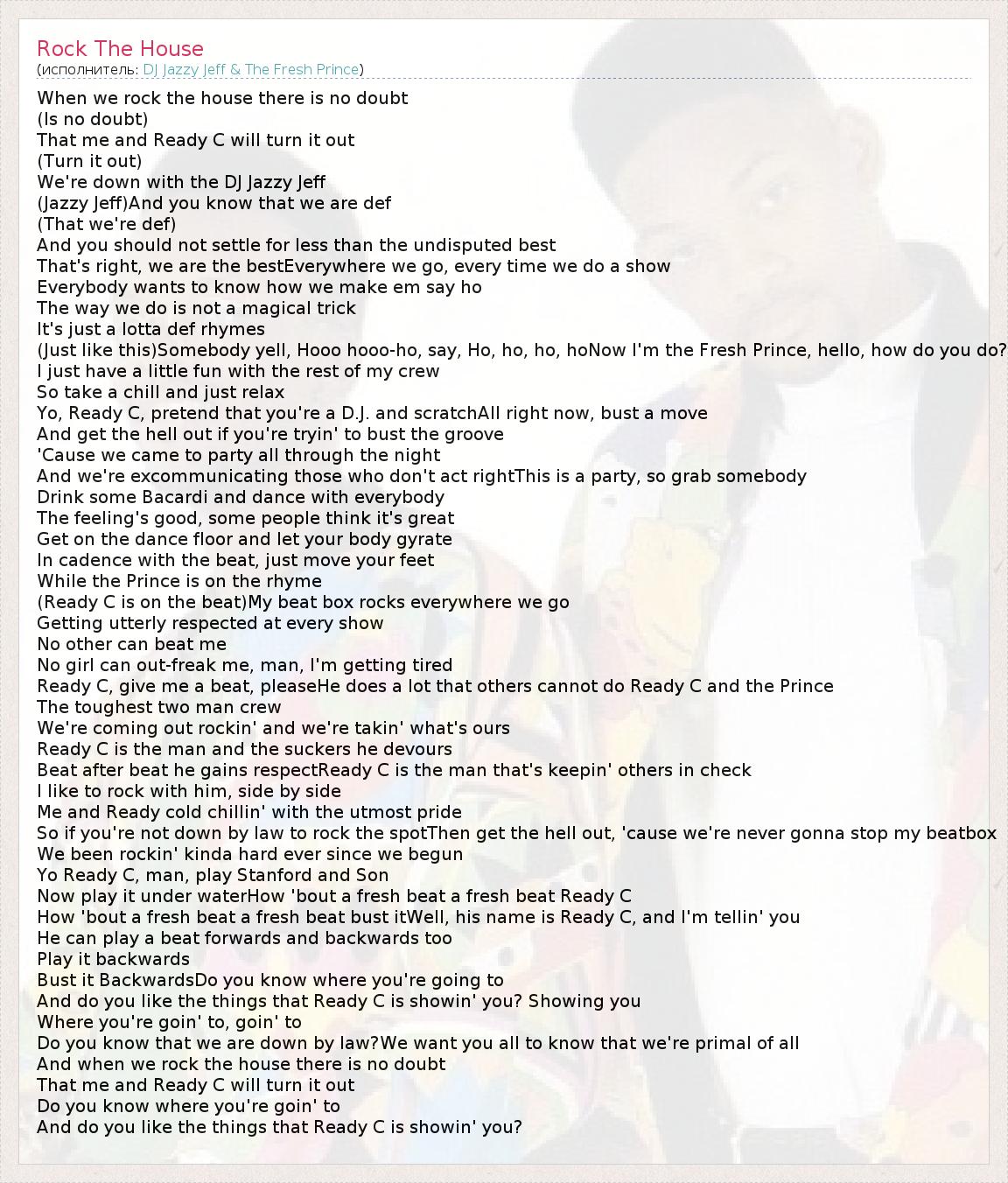 When we rock the house there is no doubt (Is no doubt) That me and Ready C will turn it out (Turn it out) We're down with the DJ Jazzy Jeff (Jazzy Jeff)And you know that we are def (That we're def) And you should not settle for less than the undisputed best That's right, we are the bestEverywhere we go, every time we do a show Everybody wants to know how we make em say ho The way we do is not a magical trick It's just a lotta def rhymes (Just like this)Somebody yell, Hooo hooo-ho, say, Ho, ho, ho, hoNow I'm the Fresh Prince, hello, how do you do? I just have a little fun with the rest of my crew So take a chill and just relax Yo, Ready C, pretend that you're a D.J. and scratchAll right now, bust a move And get the hell out if you're tryin' to bust the groove 'Cause we came to party all through the night And we're excommunicating those who don't act rightThis is a party, so grab somebody Drink some Bacardi and dance with everybody The feeling's good, some people think it's great Get on the dance floor and let your body gyrate In cadence with the beat, just move your feet While the Prince is on the rhyme (Ready C is on the beat)My beat box rocks everywhere we go Getting utterly respected at every show No other can beat me No girl can out-freak me, man, I'm getting tired Ready C, give me a beat, pleaseHe does a lot that others cannot do Ready C and the Prince The toughest two man crew We're coming out rockin' and we're takin' what's ours Ready C is the man and the suckers he devours Beat after beat he gains respectReady C is the man that's keepin' others in check I like to rock with him, side by side Me and Ready cold chillin' with the utmost pride So if you're not down by law to rock the spotThen get the hell out, 'cause we're never gonna stop my beatbox We been rockin' kinda hard ever since we begun Yo Ready C, man, play Stanford and Son Now play it under waterHow 'bout a fresh beat a fresh beat Ready C How 'bout a fresh beat a fresh beat bust itWell, his name is Ready C, and I'm tellin' you He can play a beat forwards and backwards too Play it backwards Bust it BackwardsDo you know where you're going to And do you like the things that Ready C is showin' you? Showing you Where you're goin' to, goin' to Do you know that we are down by law?We want you all to know that we're primal of all And when we rock the house there is no doubt That me and Ready C will turn it out Do you know where you're goin' to And do you like the things that Ready C is showin' you?