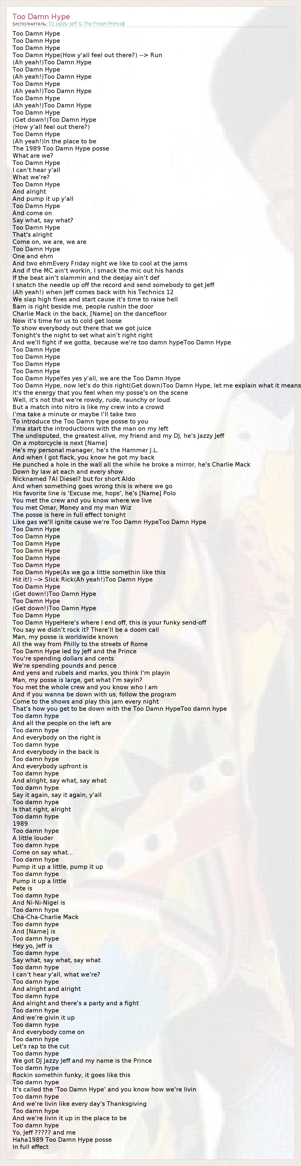 Too Damn Hype Too Damn Hype Too Damn Hype Too Damn Hype(How y'all feel out there?) --> Run (Ah yeah!)Too Damn Hype Too Damn Hype (Ah yeah!)Too Damn Hype Too Damn Hype (Ah yeah!)Too Damn Hype Too Damn Hype (Ah yeah!)Too Damn Hype Too Damn Hype (Get down!)Too Damn Hype (How y'all feel out there?) Too Damn Hype (Ah yeah!)In the place to be The 1989 Too Damn Hype posse What are we? Too Damn Hype I can't hear y'all What we're? Too Damn Hype And alright And pump it up y'all Too Damn Hype And come on Say what, say what? Too Damn Hype That's alright Come on, we are, we are Too Damn Hype One and ehm And two ehmEvery Friday night we like to cool at the jams And if the MC ain't workin, I smack the mic out his hands If the beat ain't slammin and the deejay ain't def I snatch the needle up off the record and send somebody to get Jeff (Ah yeah!) when Jeff comes back with his Technics 12 We slap high fives and start cause it's time to raise hell Bam is right beside me, people rushin the door Charlie Mack in the back, [Name] on the dancefloor Now it's time for us to cold get loose To show everybody out there that we got juice Tonight's the night to set what ain't right right And we'll fight if we gotta, because we're too damn hypeToo Damn Hype Too Damn Hype Too Damn Hype Too Damn Hype Too Damn Hype Too Damn HypeYes yes y'all, we are the Too Damn Hype Too Damn Hype, now let's do this right(Get down)Too Damn Hype, let me explain what it means It's the energy that you feel when my posse's on the scene Well, it's not that we're rowdy, rude, raunchy or loud But a match into nitro is like my crew into a crowd I'ma take a minute or maybe I'll take two To introduce the Too Damn type posse to you I'ma start the introductions with the man on my left The undisputed, the greatest alive, my friend and my DJ, he's Jazzy Jeff On a motorcycle is next [Name] He's my personal manager, he's the Hammer J.L. And when I got flack, you know he got my back He punched a hole in the wall all the while he broke a mirror, he's Charlie Mack Down by law at each and every show Nicknamed ?Al Diesel? but for short Aldo And when something goes wrong this is where we go His favorite line is 'Excuse me, hops', he's [Name] Polo You met the crew and you know where we live You met Omar, Money and my man Wiz The posse is here in full effect tonight Like gas we'll ignite cause we're Too Damn HypeToo Damn Hype Too Damn Hype Too Damn Hype Too Damn Hype Too Damn Hype Too Damn Hype Too Damn Hype Too Damn Hype(As we go a little somethin like this Hit it!) --> Slick Rick(Ah yeah!)Too Damn Hype Too Damn Hype (Get down!)Too Damn Hype Too Damn Hype (Get down!)Too Damn Hype Too Damn Hype Too Damn HypeHere's where I end off, this is your funky send-off You say we didn't rock it? There'll be a doom call Man, my posse is worldwide known All the way from Philly to the streets of Rome Too Damn Hype led by Jeff and the Prince You're spending dollars and cents We're spending pounds and pence And yens and rubels and marks, you think I'm playin Man, my posse is large, get what I'm sayin? You met the whole crew and you know who I am And if you wanna be down with us, follow the program Come to the shows and play this jam every night That's how you get to be down with the Too Damn HypeToo damn hype Too damn hype And all the people on the left are Too damn hype And everybody on the right is Too damn hype And everybody in the back is Too damn hype And everybody upfront is Too damn hype And alright, say what, say what Too damn hype Say it again, say it again, y'all Too damn hype Is that right, alright Too damn hype 1989 Too damn hype A little louder Too damn hype Come on say what... Too damn hype Pump it up a little, pump it up Too damn hype Pump it up a little Pete is Too damn hype And Ni-Ni-Nigel is Too damn hype Cha-Cha-Charlie Mack Too damn hype And [Name] is Too damn hype Hey yo, Jeff is Too damn hype Say what, say what, say what Too damn hype I can't hear y'all, what we're? Too damn hype And alright and alright Too damn hype And alright and there's a party and a fight Too damn hype And we're givin it up Too damn hype And everybody come on Too damn hype Let's rap to the cut Too damn hype We got DJ Jazzy Jeff and my name is the Prince Too damn hype Rockin somethin funky, it goes like this Too damn hype It's called the 'Too Damn Hype' and you know how we're livin Too damn hype And we're livin like every day's Thanksgiving Too damn hype And we're livin it up in the place to be Too damn hype Yo, Jeff ????? and me Haha1989 Too Damn Hype posse In full effect