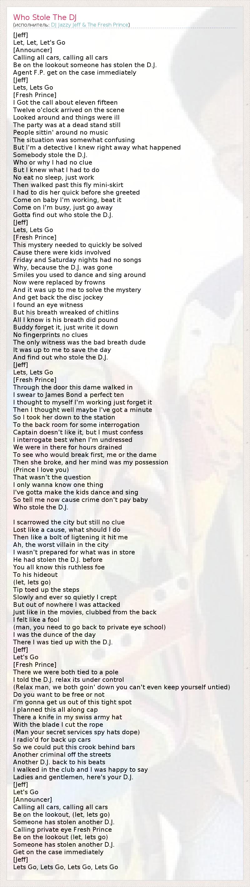 [Jeff] Let, Let, Let's Go [Announcer] Calling all cars, calling all cars Be on the lookout someone has stolen the D.J. Agent F.P. get on the case immediately [Jeff] Lets, Lets Go [Fresh Prince] I Got the call about eleven fifteen Twelve o'clock arrived on the scene Looked around and things were ill The party was at a dead stand still People sittin' around no music The situation was somewhat confusing But I'm a detective I knew right away what happened Somebody stole the D.J. Who or why I had no clue But I knew what I had to do No eat no sleep, just work Then walked past this fly mini-skirt I had to dis her quick before she greeted Come on baby I'm working, beat it Come on I'm busy, just go away Gotta find out who stole the D.J. [Jeff] Lets, Lets Go [Fresh Prince] This mystery needed to quickly be solved Cause there were kids involved Friday and Saturday nights had no songs Why, because the D.J. was gone Smiles you used to dance and sing around Now were replaced by frowns And it was up to me to solve the mystery And get back the disc jockey I found an eye witness But his breath wreaked of chitlins All I know is his breath did pound Buddy forget it, just write it down No fingerprints no clues The only witness was the bad breath dude It was up to me to save the day And find out who stole the D.J. [Jeff] Lets, Lets Go [Fresh Prince] Through the door this dame walked in I swear to James Bond a perfect ten I thought to myself I'm working just forget it Then I thought well maybe I've got a minute So I took her down to the station To the back room for some interrogation Captain doesn't like it, but I must confess I interrogate best when I'm undressed We were in there for hours drained To see who would break first, me or the dame Then she broke, and her mind was my possession (Prince I love you) That wasn't the question I only wanna know one thing I've gotta make the kids dance and sing So tell me now cause crime don't pay baby Who stole the D.J. I scarrowed the city but still no clue Lost like a cause, what should I do Then like a bolt of ligtening it hit me Ah, the worst villain in the city I wasn't prepared for what was in store He had stolen the D.J. before You all know this ruthless foe To his hideout (let, lets go) Tip toed up the steps Slowly and ever so quietly I crept But out of nowhere I was attacked Just like in the movies, clubbed from the back I felt like a fool (man, you need to go back to private eye school) I was the dunce of the day There I was tied up with the D.J. [Jeff] Let's Go [Fresh Prince] There we were both tied to a pole I told the D.J. relax its under control (Relax man, we both goin' down you can't even keep yourself untied) Do you want to be free or not I'm gonna get us out of this tight spot I planned this all along cap There a knife in my swiss army hat With the blade I cut the rope (Man your secret services spy hats dope) I radio'd for back up cars So we could put this crook behind bars Another criminal off the streets Another D.J. back to his beats I walked in the club and I was happy to say Ladies and gentlemen, here's your D.J. [Jeff] Let's Go [Announcer] Calling all cars, calling all cars Be on the lookout, (let, lets go) Someone has stolen another D.J. Calling private eye Fresh Prince Be on the lookout (let, lets go) Someone has stolen another D.J. Get on the case immediately [Jeff] Lets Go, Lets Go, Lets Go, Lets Go