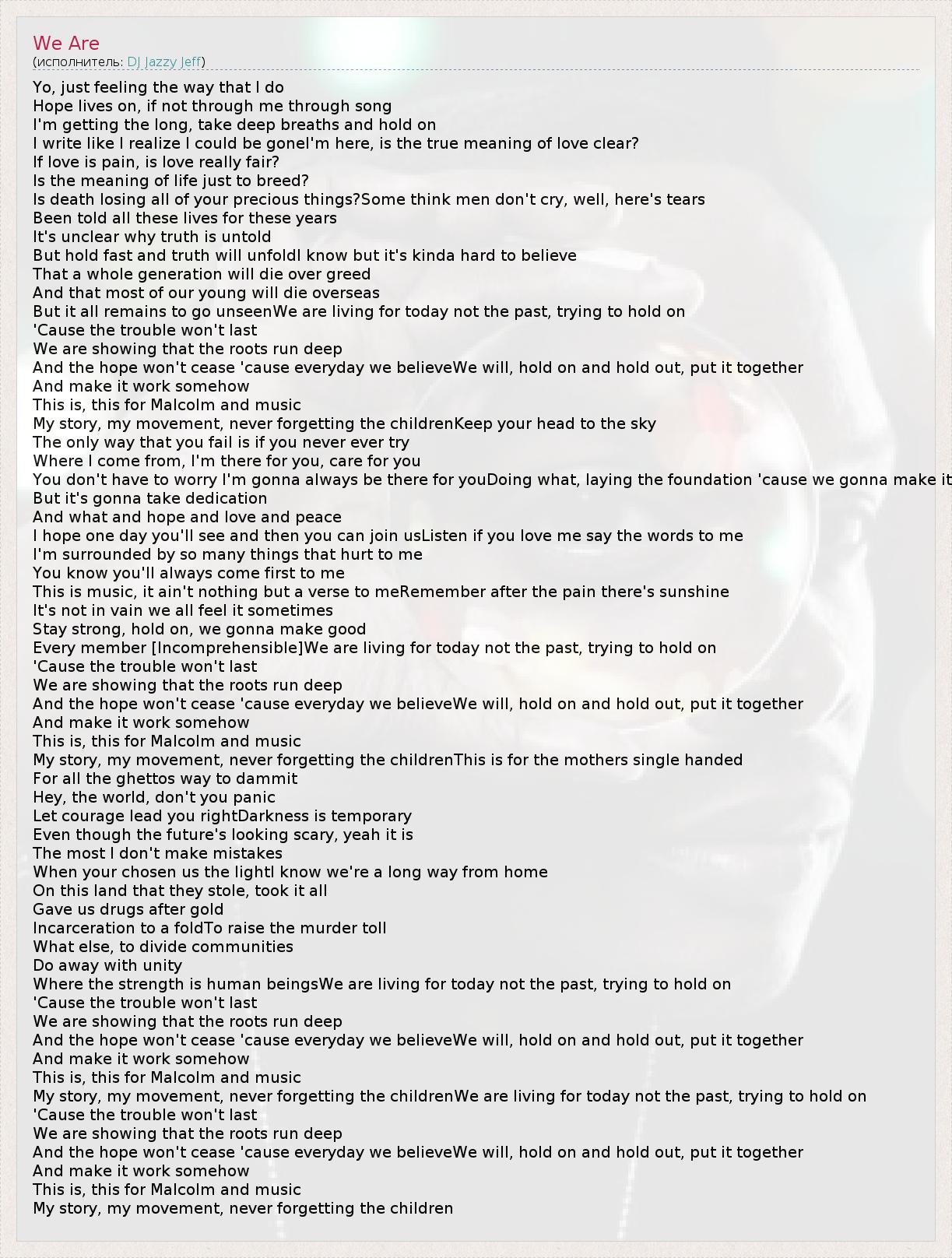Это интересно:Jeffrey Townes (born January 22, 1965 in Philadelphia, Pennsylvania), also known as DJ Jazzy Jeff or simply Jazz, is an American hip hop, R&B record producer, turntablist and actor. He is best known for his early career with Will Smith as DJ Jazzy Jeff & The Fresh Prince. DJ Jazzy Jeff graduated from John Bartram High School in Philadelphia where he is enshrined in the school's "Wall of Fame".DJ Jazzy Jeff is not to be confused with Jeffrey Myree from the earlier hip hop group Funky Four Plus One, which in fact filed and won a lawsuit over the name Jazzy Jeff against Jeff Townes and Jive records when they signed DJ Jazzy Jeff & the Fresh Prince.CareerTownes... продолжение