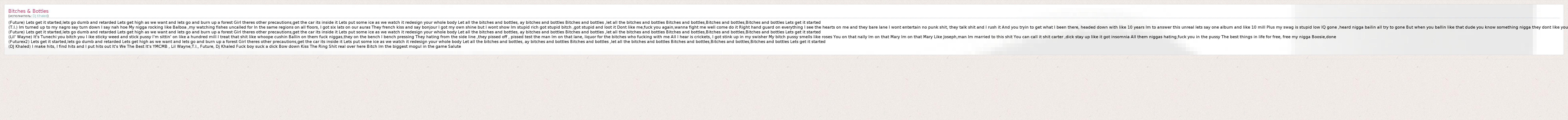 (Futurex2) Lets get it started,lets go dumb and retarded Lets get high as we want and lets go and burn up a forest Girl theres other precautions,get the car its inside it Lets put some ice as we watch it redesign your whole body Let all the bitches and bottles, ay bitches and bottles Bitches and bottles ,let all the bitches and bottles Bitches and bottles,Bitches and bottles,Bitches and bottles Lets get it started