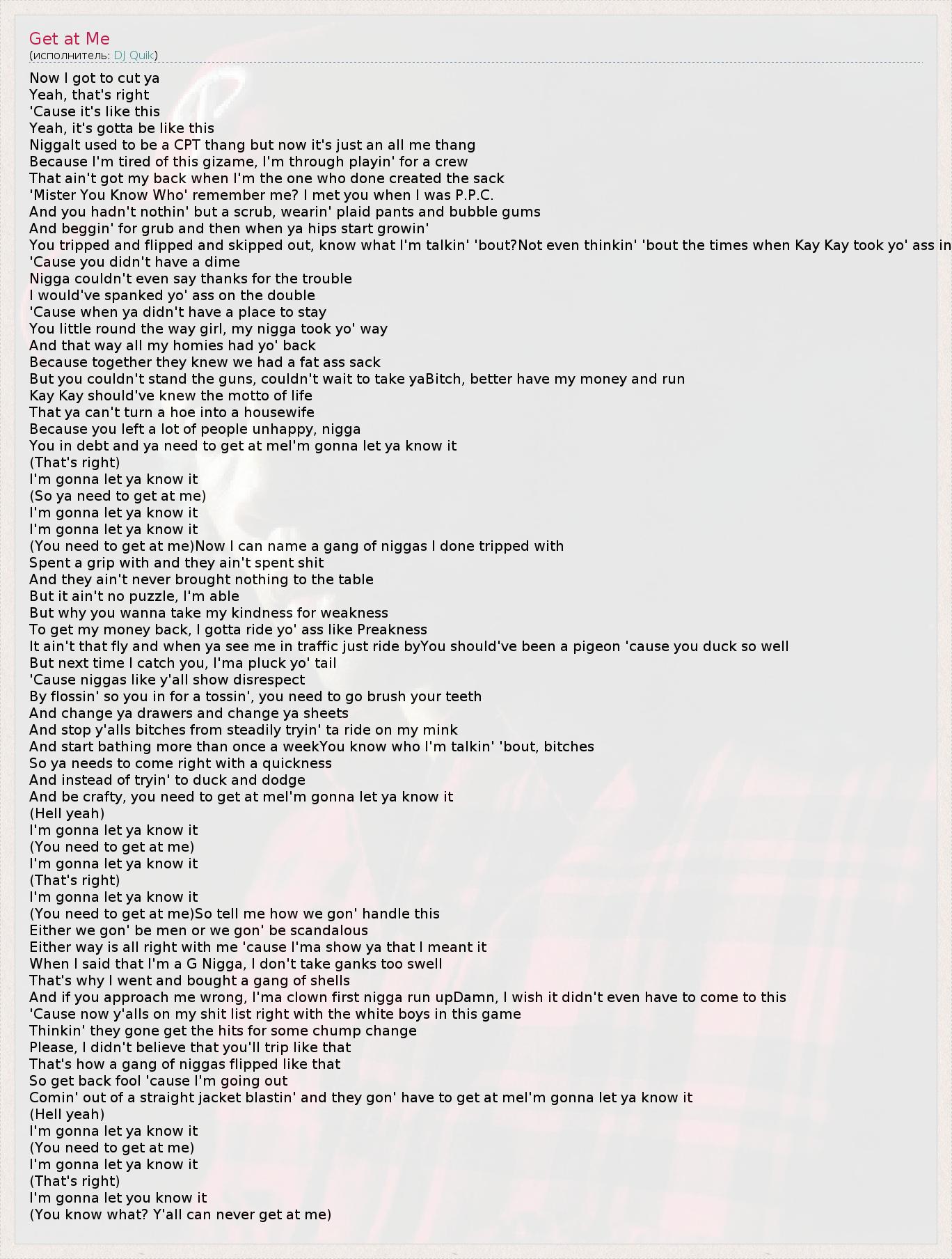 Now I got to cut ya Yeah, that's right 'Cause it's like this Yeah, it's gotta be like this NiggaIt used to be a CPT thang but now it's just an all me thang Because I'm tired of this gizame, I'm through playin' for a crew That ain't got my back when I'm the one who done created the sack 'Mister You Know Who' remember me? I met you when I was P.P.C. And you hadn't nothin' but a scrub, wearin' plaid pants and bubble gums And beggin' for grub and then when ya hips start growin' You tripped and flipped and skipped out, know what I'm talkin' 'bout?Not even thinkin' 'bout the times when Kay Kay took yo' ass in 'Cause you didn't have a dime Nigga couldn't even say thanks for the trouble I would've spanked yo' ass on the double 'Cause when ya didn't have a place to stay You little round the way girl, my nigga took yo' way And that way all my homies had yo' back Because together they knew we had a fat ass sack But you couldn't stand the guns, couldn't wait to take yaBitch, better have my money and run Kay Kay should've knew the motto of life That ya can't turn a hoe into a housewife Because you left a lot of people unhappy, nigga You in debt and ya need to get at meI'm gonna let ya know it (That's right) I'm gonna let ya know it (So ya need to get at me) I'm gonna let ya know it I'm gonna let ya know it (You need to get at me)Now I can name a gang of niggas I done tripped with Spent a grip with and they ain't spent shit And they ain't never brought nothing to the table But it ain't no puzzle, I'm able But why you wanna take my kindness for weakness To get my money back, I gotta ride yo' ass like Preakness It ain't that fly and when ya see me in traffic just ride byYou should've been a pigeon 'cause you duck so well But next time I catch you, I'ma pluck yo' tail 'Cause niggas like y'all show disrespect By flossin' so you in for a tossin', you need to go brush your teeth And change ya drawers and change ya sheets And stop y'alls bitches from steadily tryin' ta ride on my mink And start bathing more than once a weekYou know who I'm talkin' 'bout, bitches So ya needs to come right with a quickness And instead of tryin' to duck and dodge And be crafty, you need to get at meI'm gonna let ya know it (Hell yeah) I'm gonna let ya know it (You need to get at me) I'm gonna let ya know it (That's right) I'm gonna let ya know it (You need to get at me)So tell me how we gon' handle this Either we gon' be men or we gon' be scandalous Either way is all right with me 'cause I'ma show ya that I meant it When I said that I'm a G Nigga, I don't take ganks too swell That's why I went and bought a gang of shells And if you approach me wrong, I'ma clown first nigga run upDamn, I wish it didn't even have to come to this 'Cause now y'alls on my shit list right with the white boys in this game Thinkin' they gone get the hits for some chump change Please, I didn't believe that you'll trip like that That's how a gang of niggas flipped like that So get back fool 'cause I'm going out Comin' out of a straight jacket blastin' and they gon' have to get at meI'm gonna let ya know it (Hell yeah) I'm gonna let ya know it (You need to get at me) I'm gonna let ya know it (That's right) I'm gonna let you know it (You know what? Y'all can never get at me)