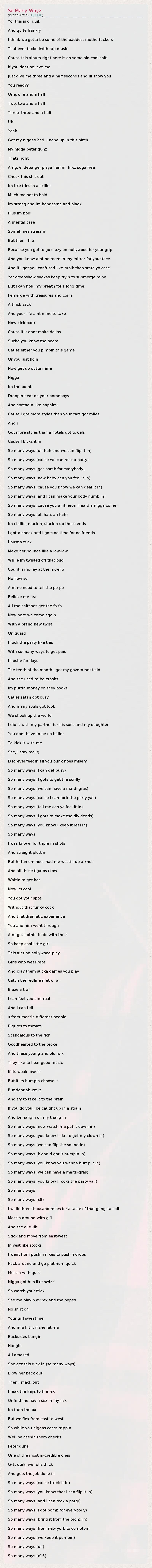 Yo, this is dj quik And quite frankly I think we gotta be some of the baddest motherfuckers That ever fuckedwith rap music Cause this album right here is on some old cool shit If you dont believe me Just give me three and a half seconds and Ill show you You ready? One, one and a half Two, two and a half Three, three and a half Uh Yeah Got my niggas 2nd ii none up in this bitch My nigga peter gunz Thats right Amg, el debarge, playa hamm, hi-c, suga free Check this shit out Im like fries in a skillet Much too hot to hold Im strong and Im handsome and black Plus Im bold A mental case Sometimes stressin But then I flip Because you got to go crazy on hollywood for your grip And you know aint no room in my mirror for your face And if I got yall confused like rubik then state yo case Yet creepshow suckas keep tryin to submerge mine But I can hold my breath for a long time I emerge with treasures and coins A thick sack And your life aint mine to take Now kick back Cause if it dont make dollas Sucka you know the poem Cause either you pimpin this game Or you just hoin Now get up outta mine Nigga Im the bomb Droppin heat on your homeboys And spreadin like napalm Cause I got more styles than your cars got miles And i Got more styles than a hotels got towels Cause I kicks it in So many ways (uh huh and we can flip it in) So many ways (cause we can rock a party) So many ways (got bomb for everybody) So many ways (now baby can you feel it in) So many ways (cause you know we can deal it in) So many ways (and I can make your body numb in) So many ways (cause you aint never heard a nigga come) So many ways (ah hah, ah hah) Im chillin, mackin, stackin up these ends I gotta check and I gots no time for no friends I bust a trick Make her bounce like a low-low While Im twisted off that bud Countin money at the mo-mo No flow so Aint no need to tell the po-po Believe me bra All the snitches get the fo-fo Now here we come again With a brand new twist On guard I rock the party like this With so many ways to get paid I hustle for days The tenth of the month I get my government aid And the used-to-be-crooks Im puttin money on they books Cause satan got busy And many souls got took We shook up the world I did it with my partner for his sons and my daughter You dont have to be no baller To kick it with me See, I stay real g D forever feedin all you punk hoes misery So many ways (I can get busy) So many ways (I gots to get the scrilly) So many ways (we can have a mardi-gras) So many ways (cause I can rock the party yall) So many ways (tell me can ya feel it in) So many ways (I gots to make the dividends) So many ways (you know I keep it real in) So many ways I was known for triple m shots And straight plottin But hitten em hoes had me wastin up a knot And all these figaros crow Waitin to get hot Now its cool You got your spot Without that funky cock And that dramatic experience You and him went through Aint got nothin to do with the k So keep cool little girl This aint no hollywood play Girls who wear reps And play them sucka games you play Catch the redline metro rail Blaze a trail I can feel you aint real And I can tell >from meetin different people Figures to throats Scandalous to the rich Goodhearted to the broke And these young and old folk They like to hear good music If its weak lose it But if its bumpin choose it But dont abuse it And try to take it to the brain If you do youll be caught up in a strain And be hangin on my thang in So many ways (now watch me put it down in) So many ways (you know I like to get my clown in) So many ways (we can flip the sound in) So many ways (k and d got it humpin in) So many ways (you know you wanna bump it in) So many ways (we can have a mardi-gras) So many ways (you know I rocks the party yall) So many ways So many ways (x8) I walk three thousand miles for a taste of that gangsta shit Messin around with g-1 And the dj quik Stick and move from east-west In vest like stocks I went from pushin nikes to pushin drops Fuck around and go platinum quick Messin with quik Nigga got hits like swizz So watch your trick See me playin avirex and the pepes No shirt on Your girl sweat me And ima hit it if she let me Backsides bangin Hangin All amazed She get this dick in (so many ways) Blow her back out Then I mack out Freak the keys to the lex Or find me havin sex in my nsx Im from the bx But we flex from east to west So while you niggas coast-trippin Well be cashin them checks Peter gunz One of the most in-credible ones G-1, quik, we rolls thick And gets the job done in So many ways (cause I kick it in) So many ways (you know that I can flip it in) So many ways (and I can rock a party) So many ways (I got bomb for everybody) So many ways (bring it from the bronx in) So many ways (from new york to compton) So many ways (we keep it pumpin) So many ways (uh) So many ways (x16)