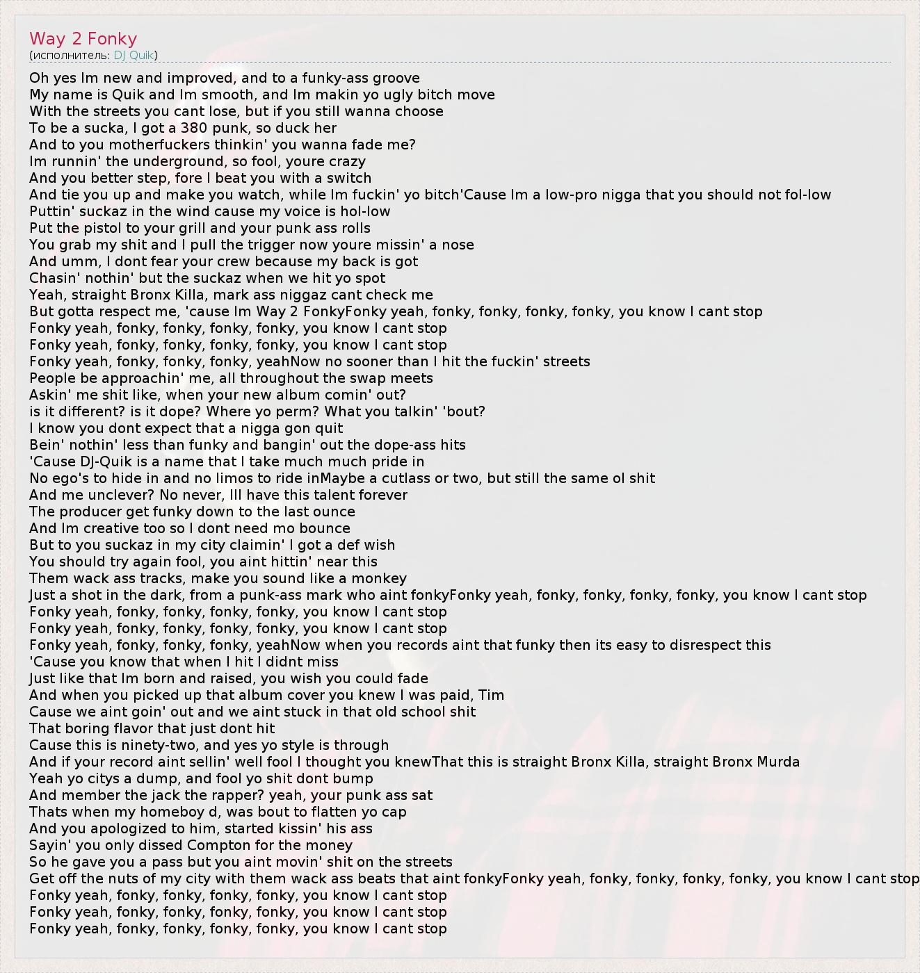 But gotta respect me, 'cause Im Way 2 FonkyFonky yeah, fonky, fonky, fonky, fonky, you know I cant stop