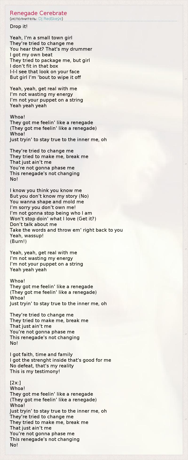 Drop it! Yeah, I'm a small town girl They're tried to change me You hear that? That's my drummer I got my own beat They tried to package me, but girl I don't fit in that box I-I-I see that look on your face But girl I'm 'bout to wipe it off Yeah, yeah, get real with me I'm not wasting my energy I'm not your puppet on a string Yeah yeah yeah Whoa! They got me feelin' like a renegade (They got me feelin' like a renegade) Whoa! Just tryin' to stay true to the inner me, oh They're tried to change me They tried to make me, break me That just ain't me You're not gonna phase me This renegade's not changing No! I know you think you know me But you don't know my story (No) You wanna shape and mold me I'm sorry you don't own me! I'm not gonna stop being who I am Won't stop doin' what I love (Get it?) Don't talk about me Take the words and throw em' right back to you Yeah, wassup! (Burn!) Yeah, yeah, get real with me I'm not wasting my energy I'm not your puppet on a string Yeah yeah yeah Whoa! They got me feelin' like a renegade (They got me feelin' like a renegade) Whoa! Just tryin' to stay true to the inner me, oh They're tried to change me They tried to make me, break me That just ain't me You're not gonna phase me This renegade's not changing No! I got faith, time and family I got the strenght inside that's good for me No defeat, that's my reality This is my testimony! [2x:] Whoa! They got me feelin' like a renegade (They got me feelin' like a renegade) Whoa! Just tryin' to stay true to the inner me, oh They're tried to change me They tried to make me, break me That just ain't me You're not gonna phase me This renegade's not changing No!