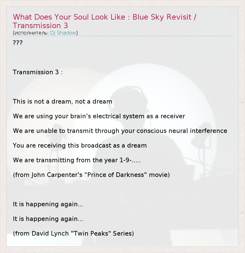 А как ты думаешь, о чем песня "What Does Your Soul Look Like : Blue Sky Revisit / Transmission 3" ?