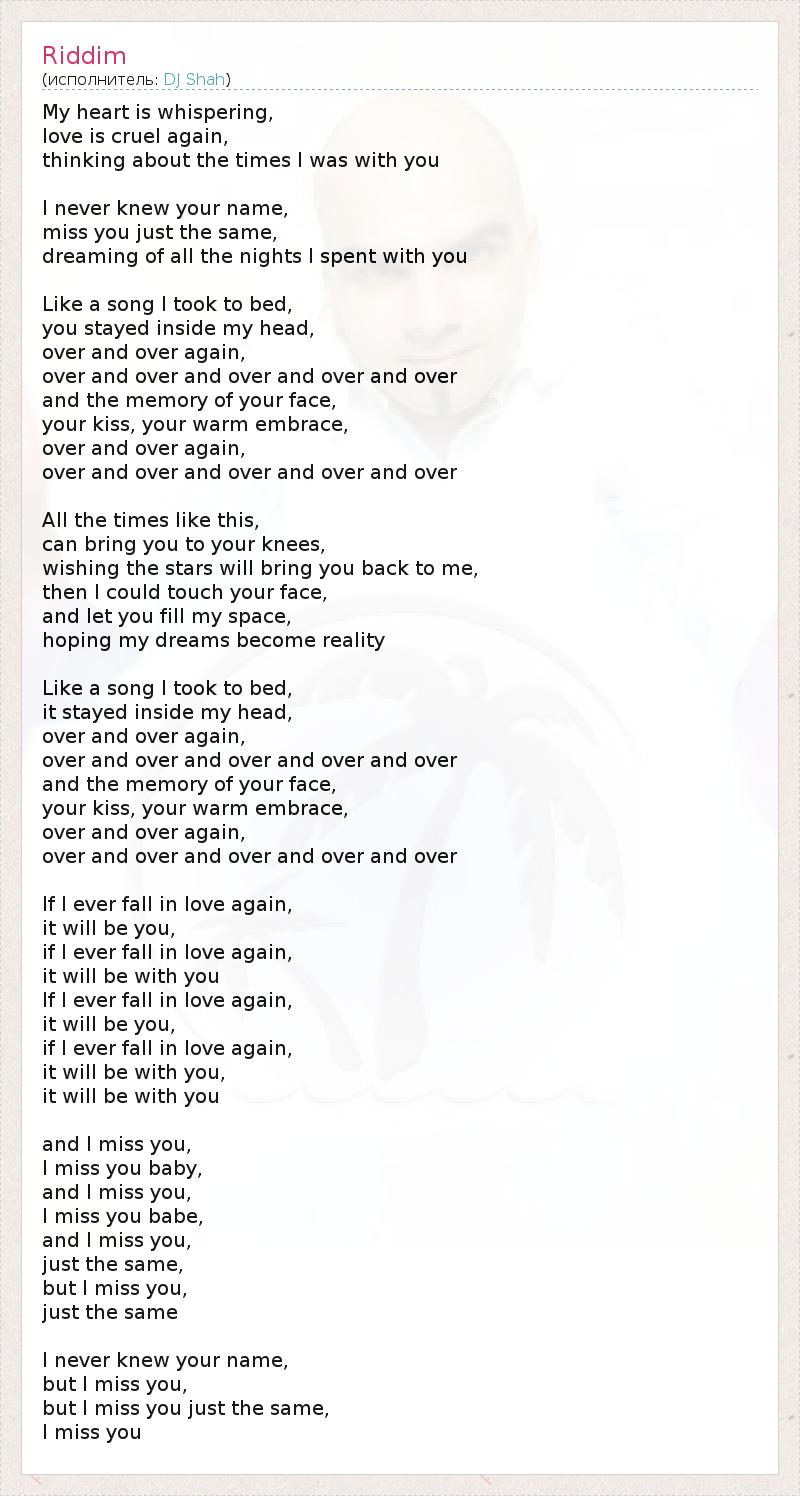 My heart is whispering, love is cruel again, thinking about the times I was with you I never knew your name, miss you just the same, dreaming of all the nights I spent with you Like a song I took to bed, you stayed inside my head, over and over again, over and over and over and over and over and the memory of your face, your kiss, your warm embrace, over and over again, over and over and over and over and over All the times like this, can bring you to your knees, wishing the stars will bring you back to me, then I could touch your face, and let you fill my space, hoping my dreams become reality Like a song I took to bed, it stayed inside my head, over and over again, over and over and over and over and over and the memory of your face, your kiss, your warm embrace, over and over again, over and over and over and over and over If I ever fall in love again, it will be you, if I ever fall in love again, it will be with you If I ever fall in love again, it will be you, if I ever fall in love again, it will be with you, it will be with you and I miss you, I miss you baby, and I miss you, I miss you babe, and I miss you, just the same, but I miss you, just the same I never knew your name, but I miss you, but I miss you just the same, I miss you